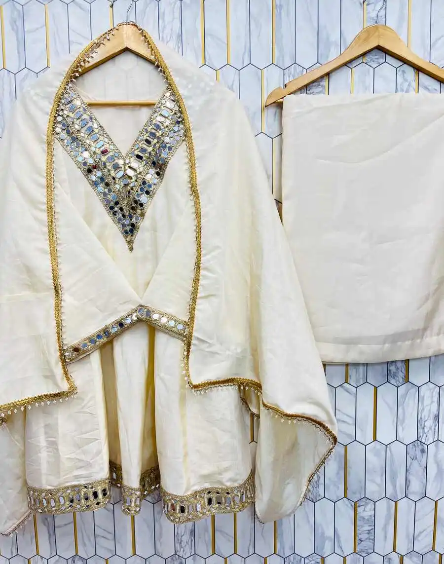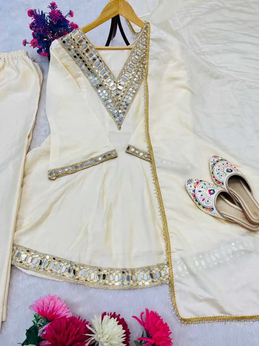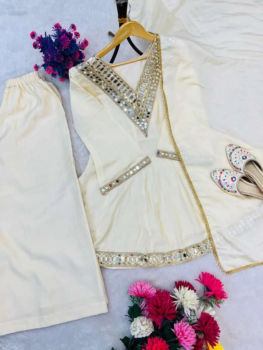 NEW ARRIVAL CHINON SILK REAL MIRROR WORK TOP PALAZZO WITH DUPATTA OFF WHITE