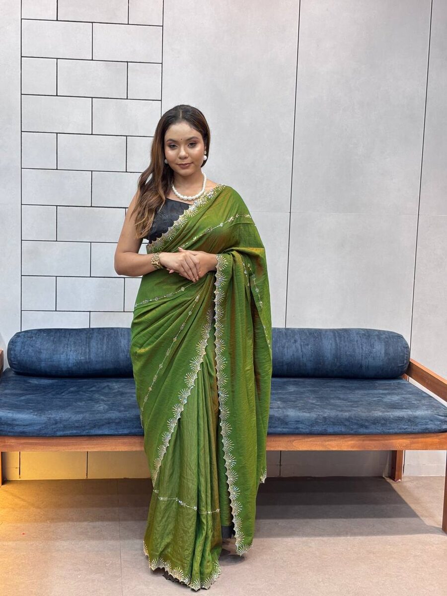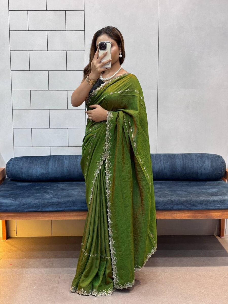 NEW ARRIVAL CHOCOLATE NC DAIMOND WORK WITH CUT WORK AND HAND WORK SAREE WITH UNSTITCHED BLOUSE GREEN