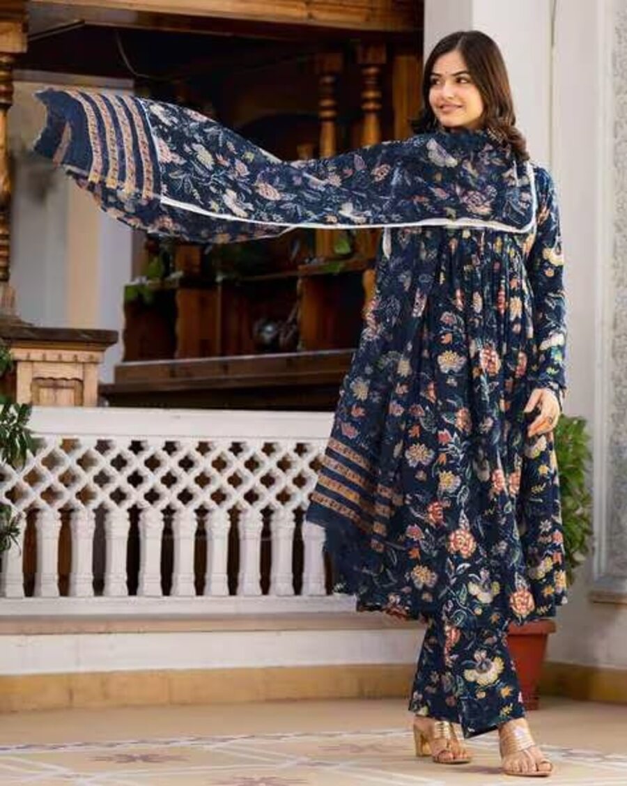 NEW ARRIVAL COTTON BLEND DIGITAL PRINTED TOP BOTTOM WITH DUPATTA NAVY BLUE
