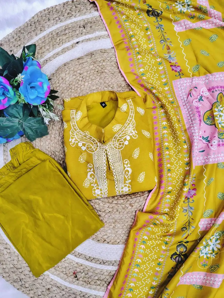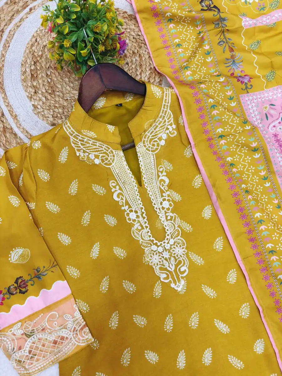NEW ARRIVAL COTTON DIGITAL PRINT WITH EMBROIDERY WORK TOP BOTTOM WITH DUPATTA YELLOW