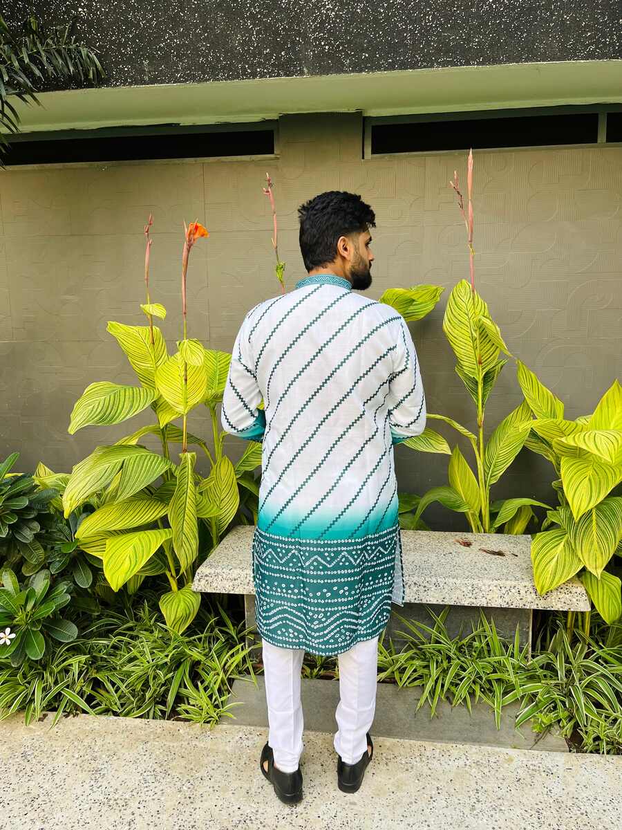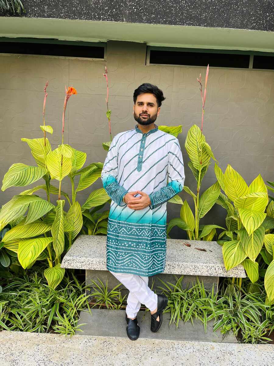 NEW ARRIVAL COTTON LEHERIYA PATTERN WITH BANDHNI DAMAN PRINT WORK MEN’S KURTA PAYJAMA RAMA