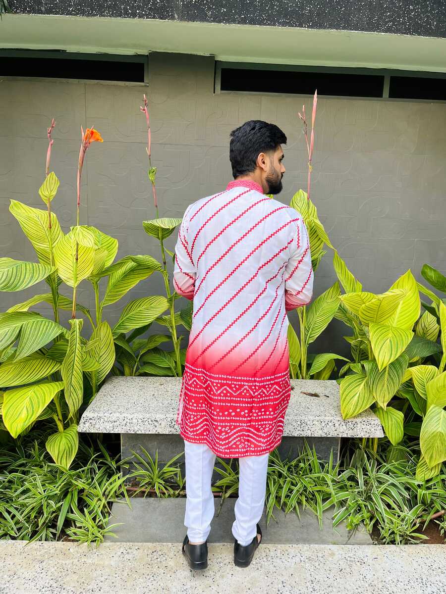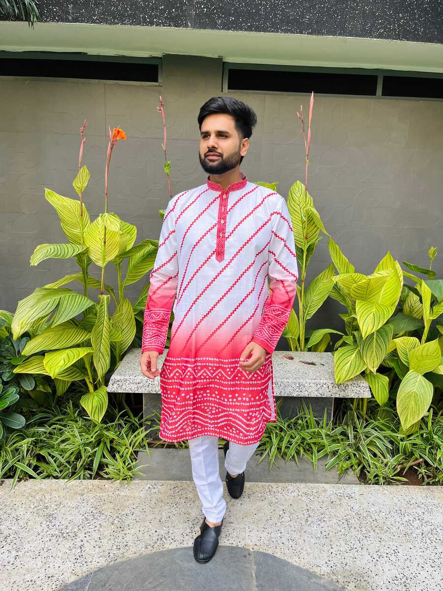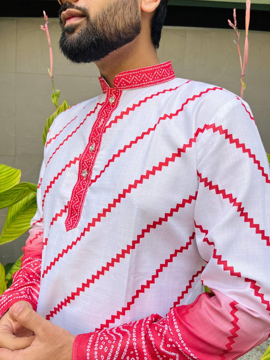 NEW ARRIVAL COTTON LEHERIYA PATTERN WITH BANDHNI DAMAN PRINT WORK MEN’S KURTA PAYJAMA RANI