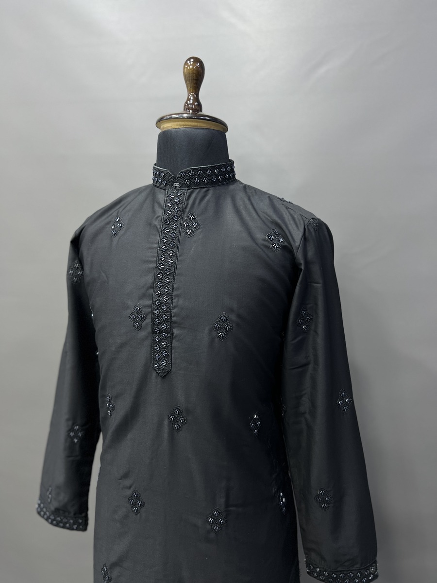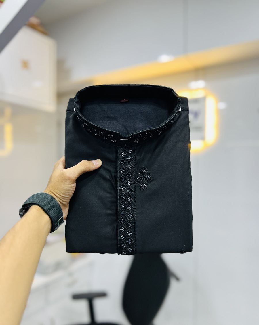 NEW ARRIVAL COTTON MATCHING VAL-MOTI BUTTA WORK MEN’S KURTA PAYJAMA BLACK