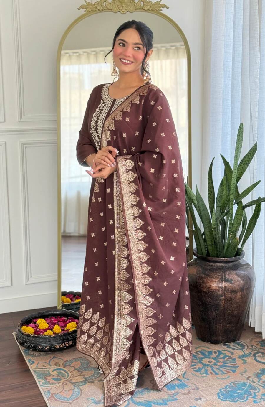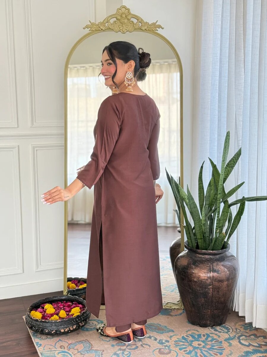 NEW ARRIVAL COTTON SILK EMBROIDERY WORK TOP BOTTOM WITH DUPATTA BROWN