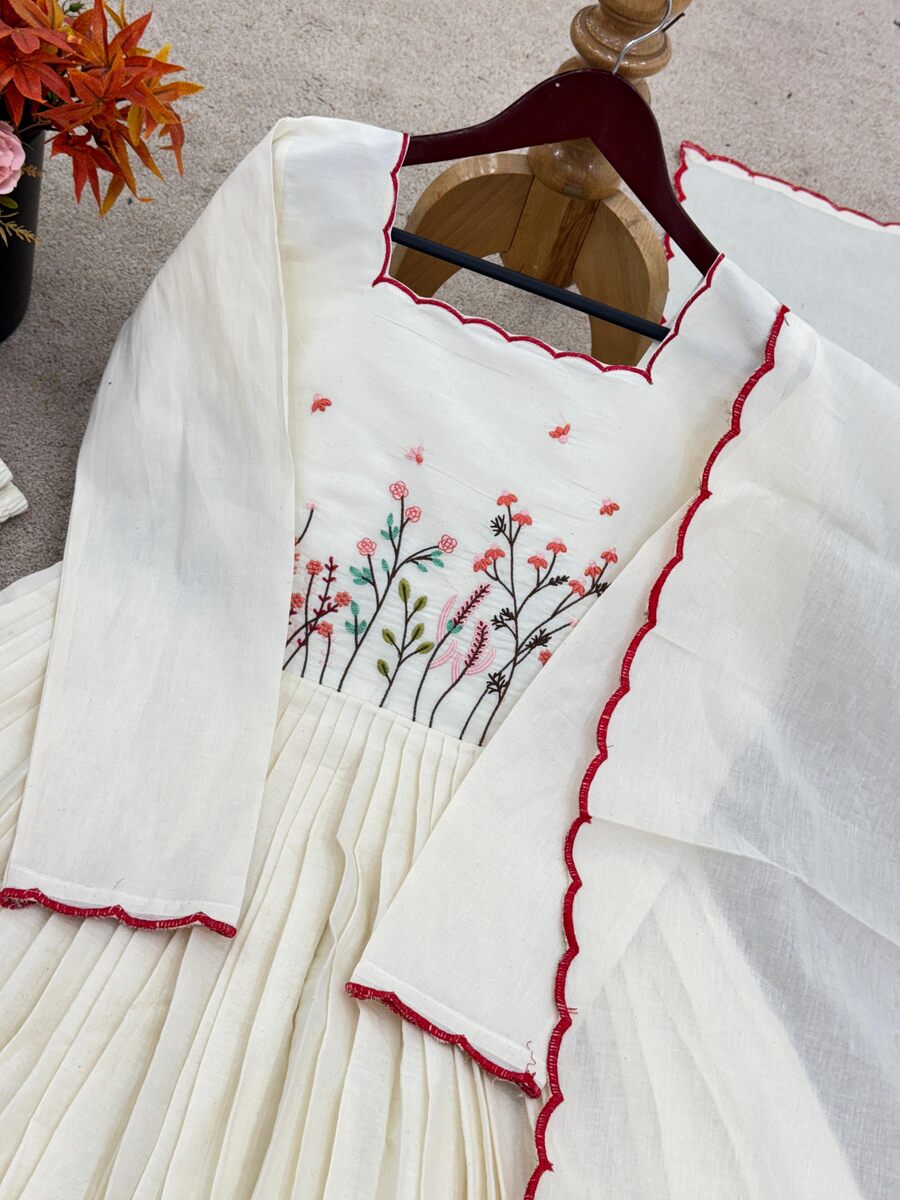 NEW ARRIVAL COTTON THREAD WORK GOWN BOTTOM WITH DUAPTTA WHITE