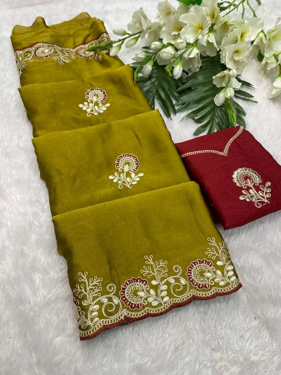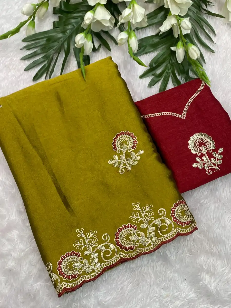 NEW ARRIVAL CRUSH SILK MULTI CODING DAGA & GOTA EMBROIDERY WORK BORDER SAREE WITH UNSTITCHED BLOUSE MUSTARD