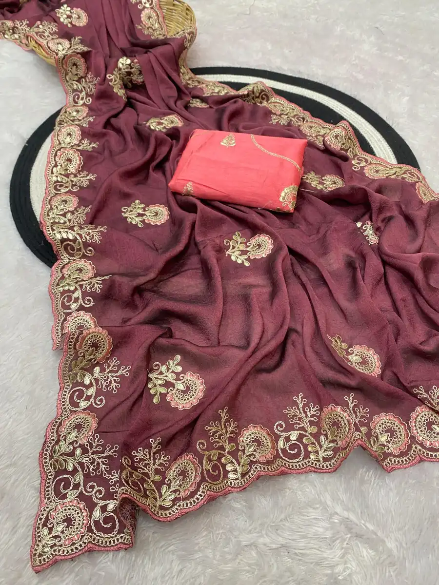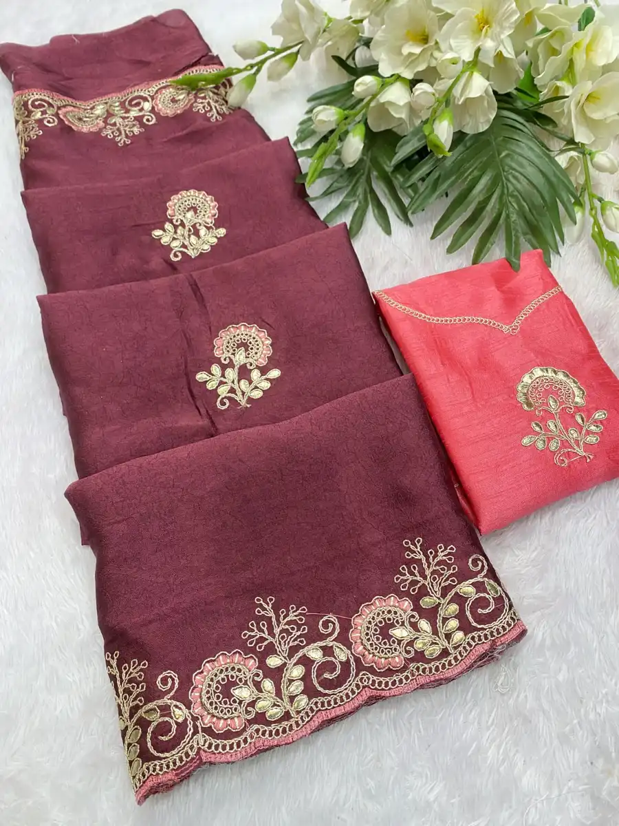 NEW ARRIVAL CRUSH SILK MULTI CODING DAGA & GOTA EMBROIDERY WORK BORDER SAREE WITH UNSTITCHED BLOUSE WINE