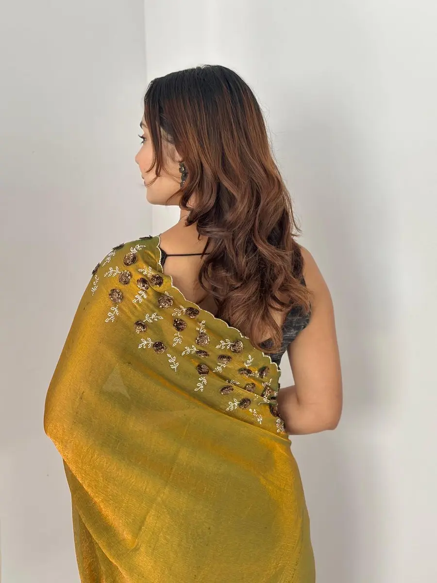 NEW ARRIVAL FENDY CHIFFON DIAMOND CUT DANA JHARKAN WORK WITH HANDWORK SEQUNCE BUTTA WORK SAREE WITH UNSTITCHED BLOUSE MUSTARD