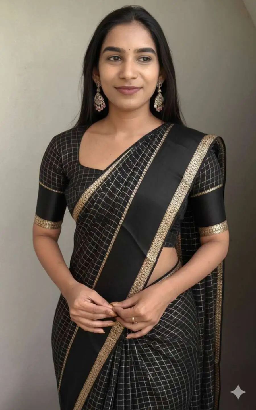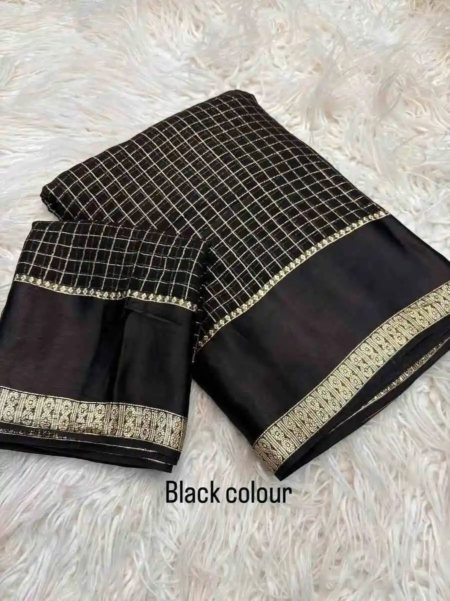 NEW ARRIVAL GEORGETTE CHECKS WEAVING AND STUNNING SATIN PATTA BORDER WORK SAREE WITH UNSTITCHED BLOUSE BLACK