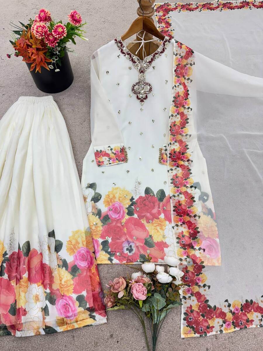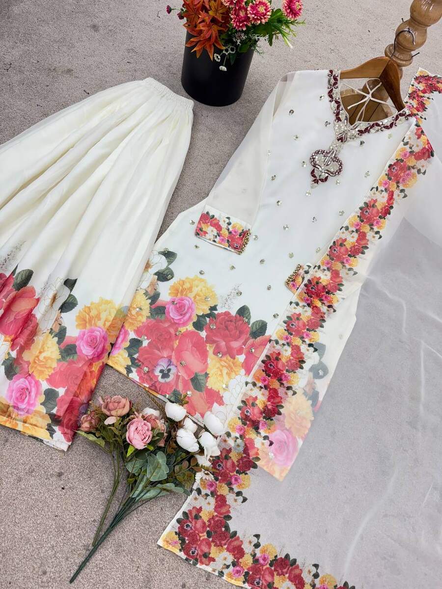 NEW ARRIVAL GEORGETTE EMBROIDERY SEQUENCE WORK WITH DIGITAL PRINT WORK TOP PALAZZO WITH DUPATTA WHITE