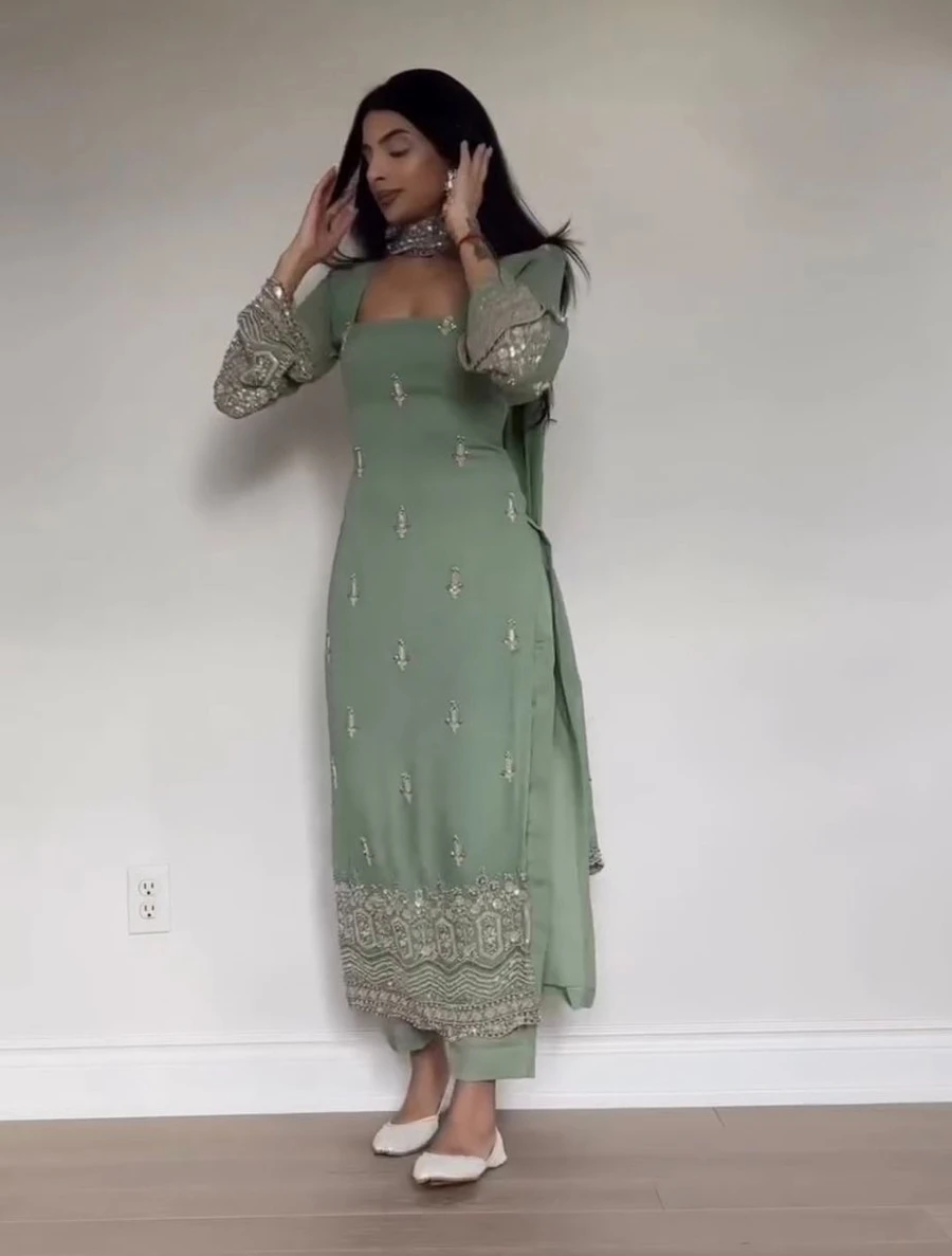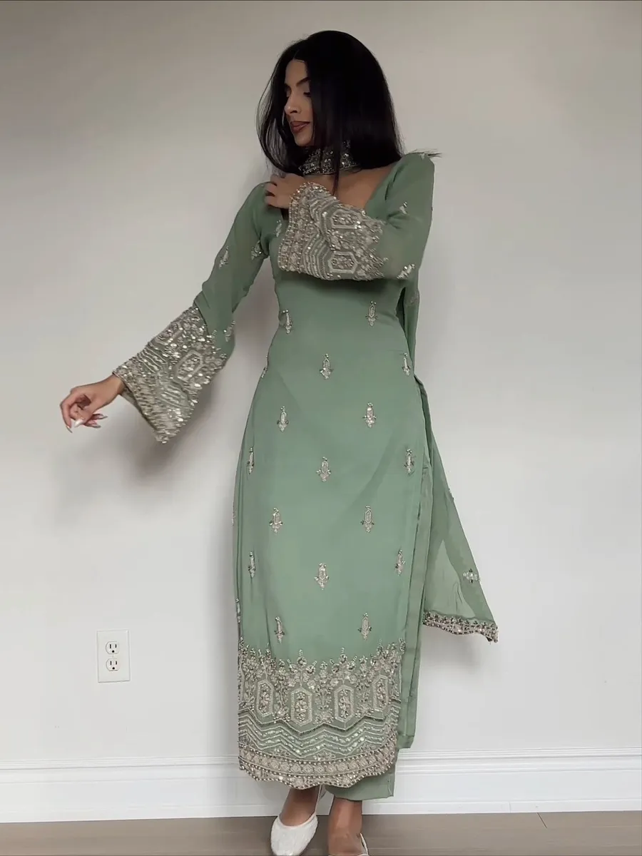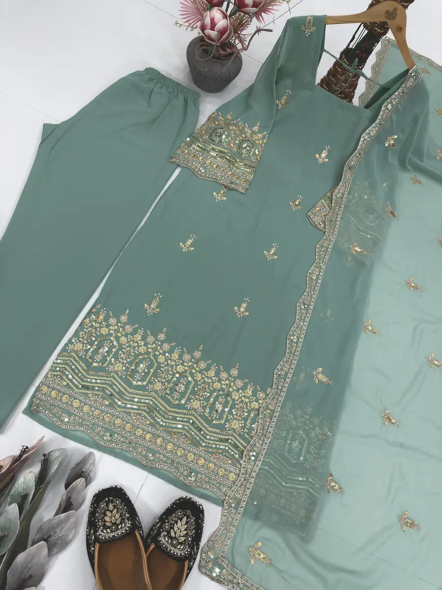 NEW ARRIVAL GEORGETTE EMBROIDERY SEQUENCE WORK WITH HAND WORK TOP BOTTOM WITH DUPATTA MINT