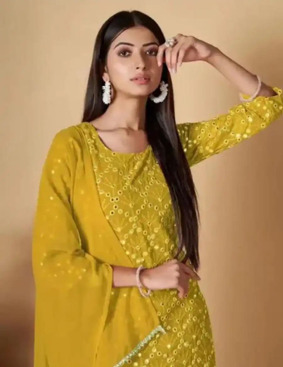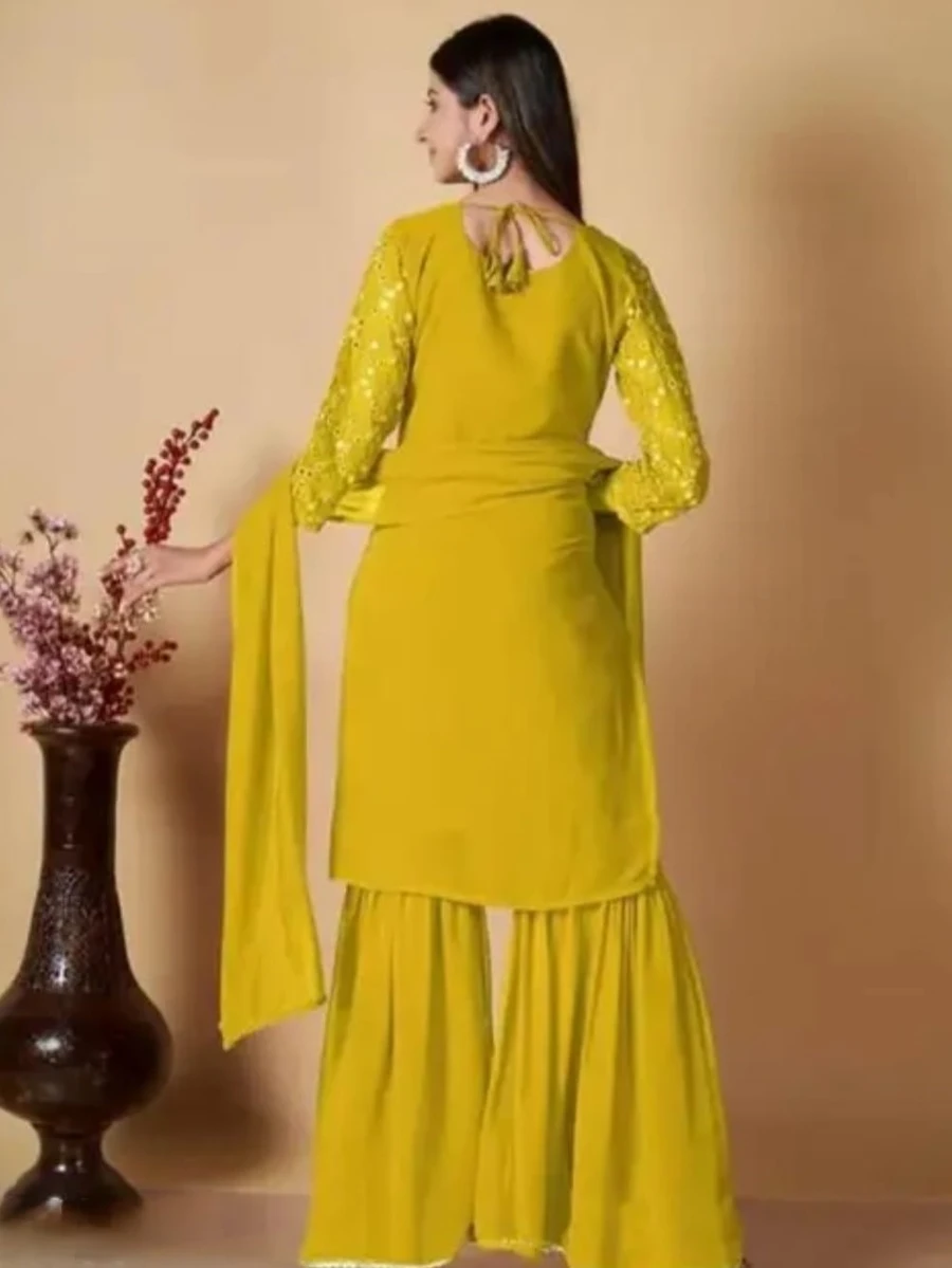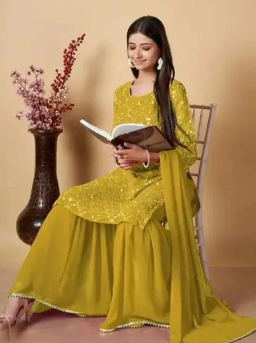NEW ARRIVAL GEORGETTE EMBROIDERY WORK TOP SHARARA WITH DUPATTA YELLOW