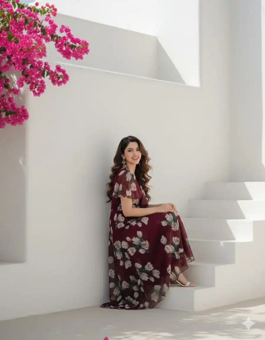 NEW ARRIVAL GEORGETTE FLORAL PRINTED WORK ONE PIECE DRESS MAROON