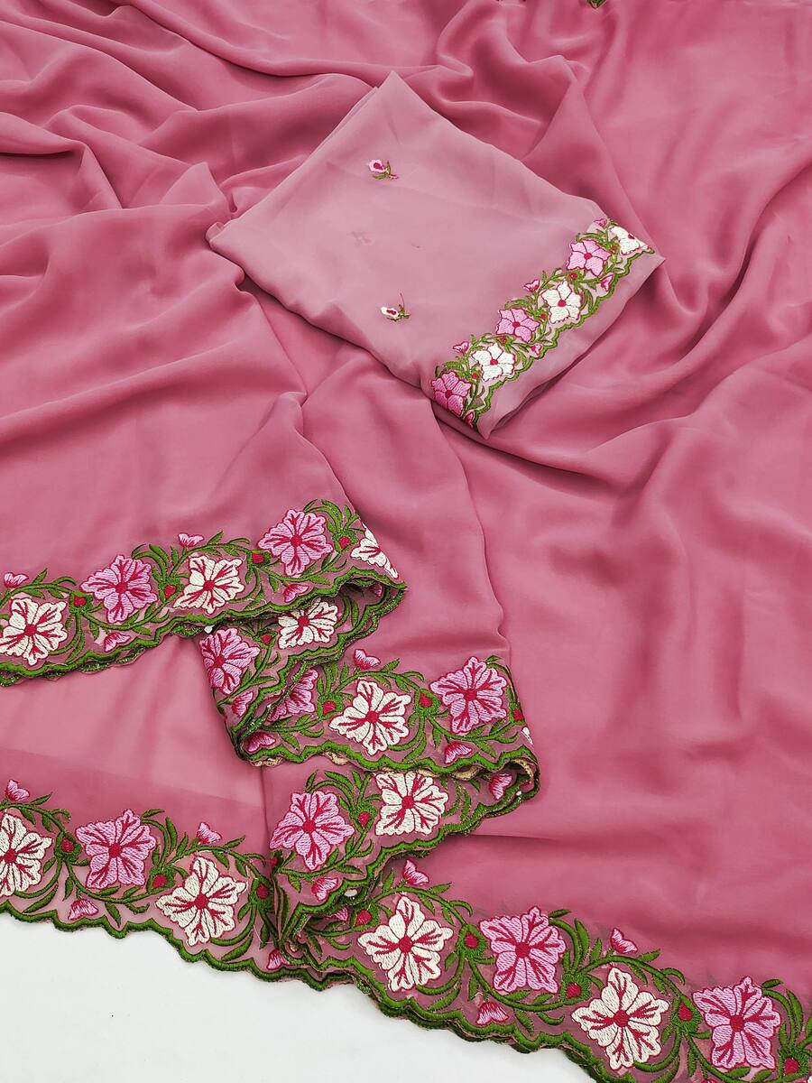 NEW ARRIVAL GEORGETTE MULTI THREAD EMBROIDERY WORK SAREE WITH UNSTITCHED BLOUSE PINK
