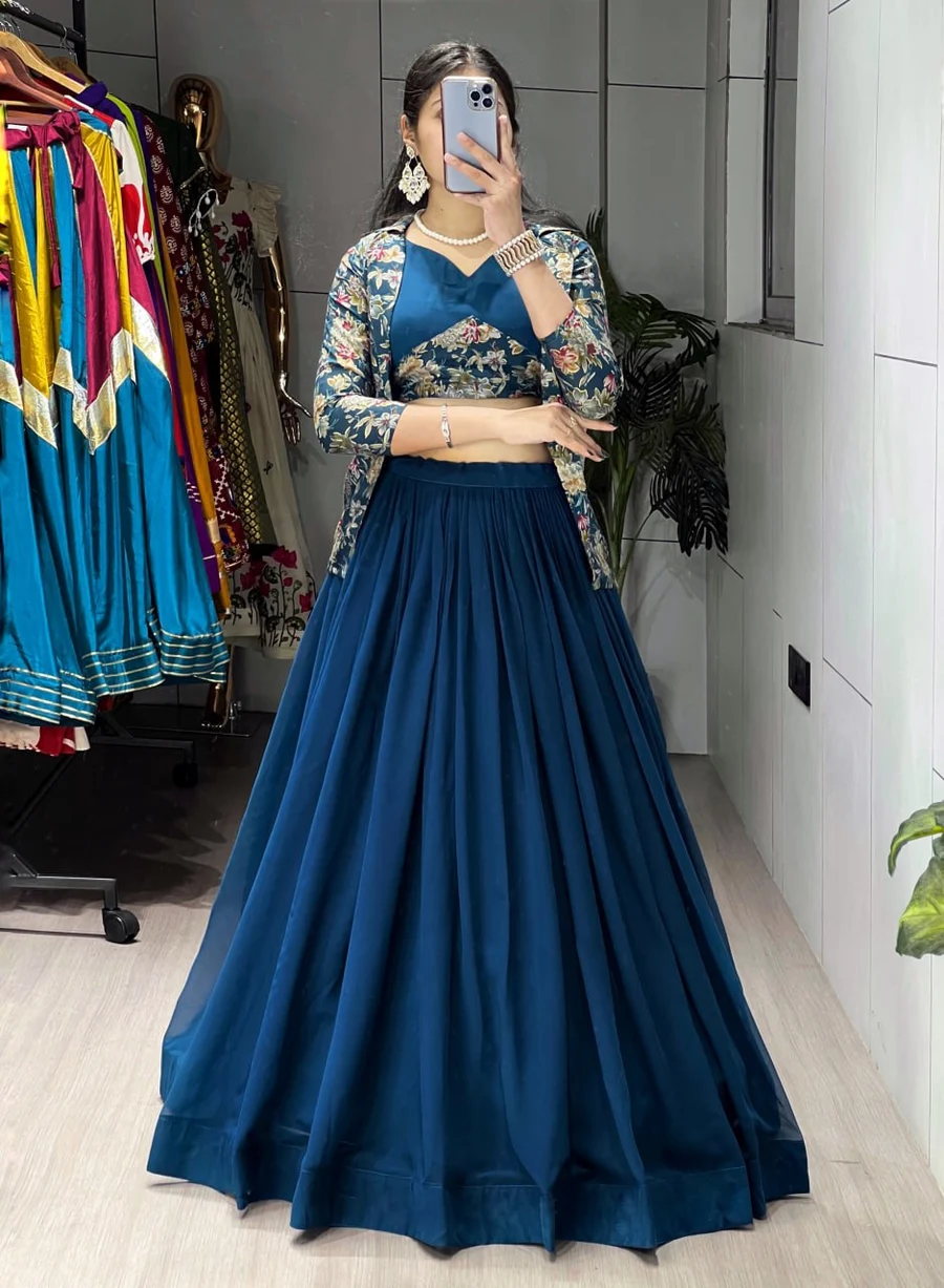 NEW ARRIVAL GEORGETTE PLIAN LEHENGA WITH STITCHED BLOUSE AND PRINT WITH FOIL WORK KOTI TEAL