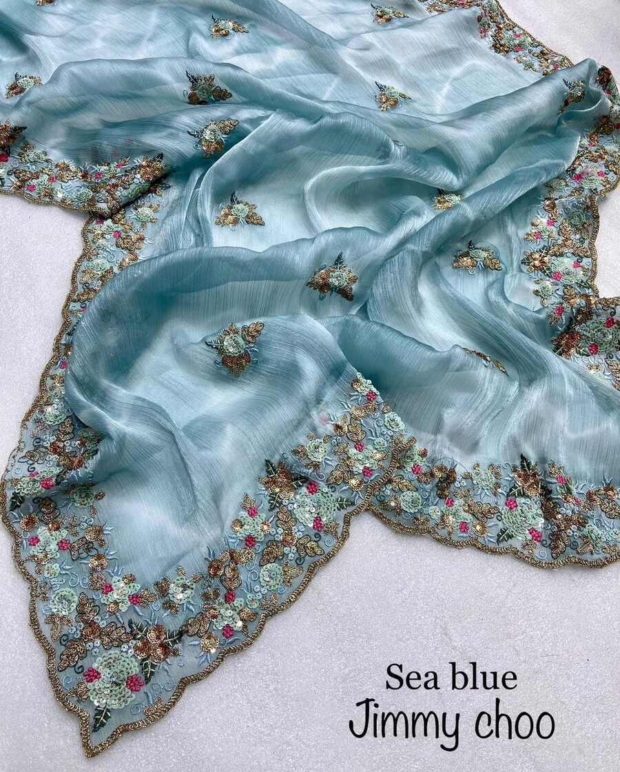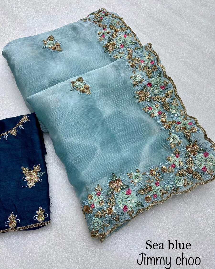 SAREE FABRIC : PURE SOFT JIMMY CHOO WITH HEAVY EMBROIDERY MULTI TREADS , CODING & SEQUENCE WORK & FANCY CUT WORK BORDER
