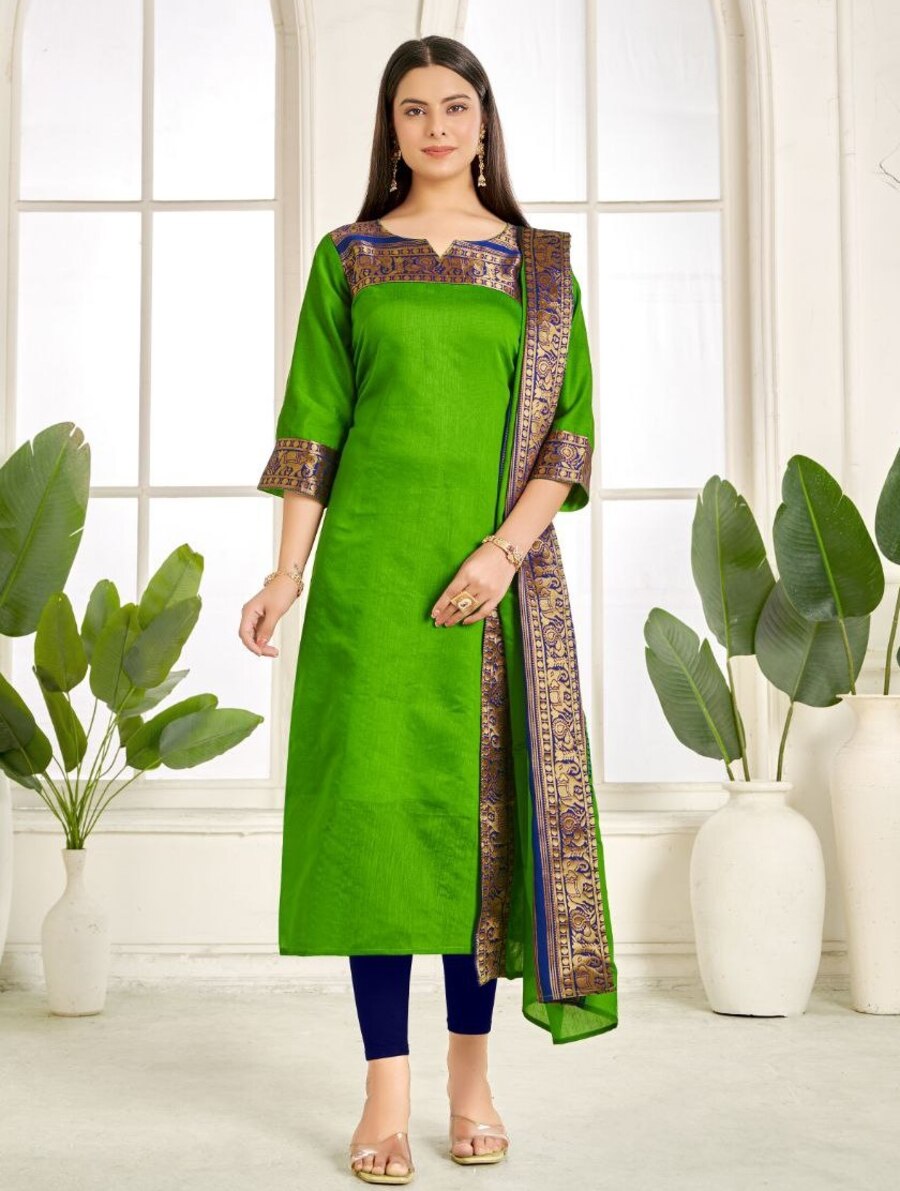 NEW ARRIVAL KANCHI COTTON JACQUARD WEAVING WORK TOP DUPATTA SET GREEN
