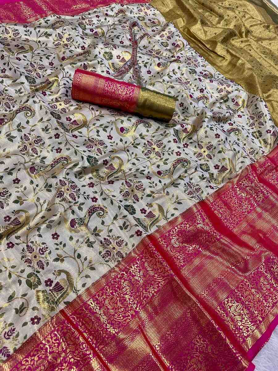 NEW ARRIVAL KANJIVARAM SILK GOLD ZARI RICH WEAVING WORK SAREE WITH UNSTITCHED BLOUSE WHITE