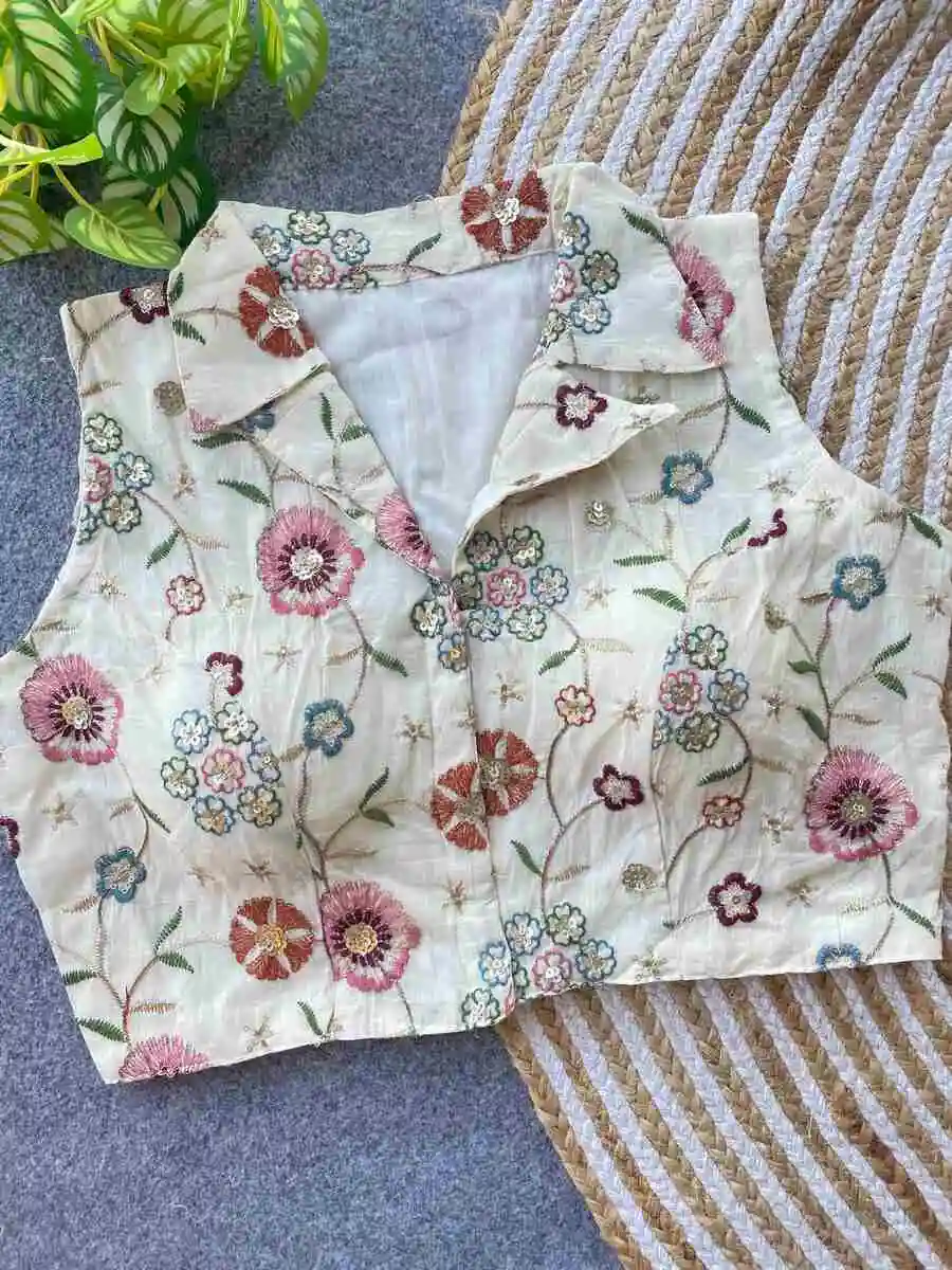 NEW ARRIVAL KHADI COTTON EMBROIDERY WORK STITCHED BLOUSE OFF WHITE AND BROWN