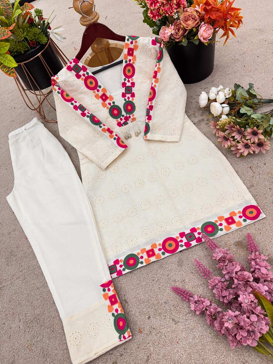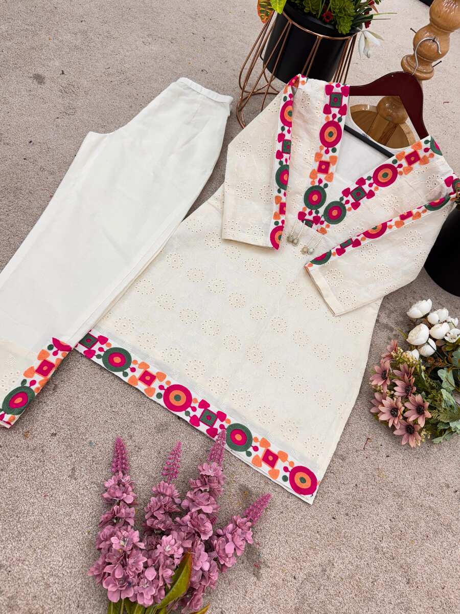 NEW ARRIVAL KHADI COTTON SCHIFLI WORK WITH THREAD WORK TOP PENT SET OFF WHITE