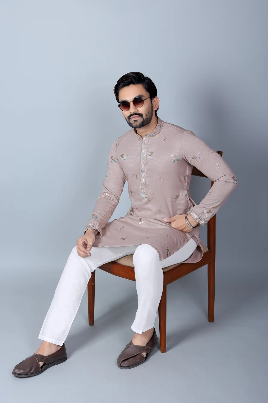 NEW ARRIVAL KHADI SILK THREAD WORK MEN’S KURTA PAYJAMA GREY