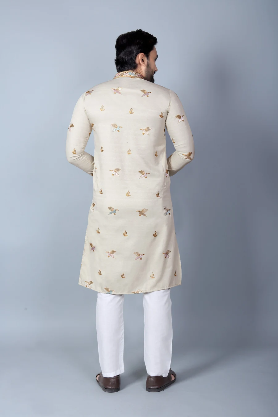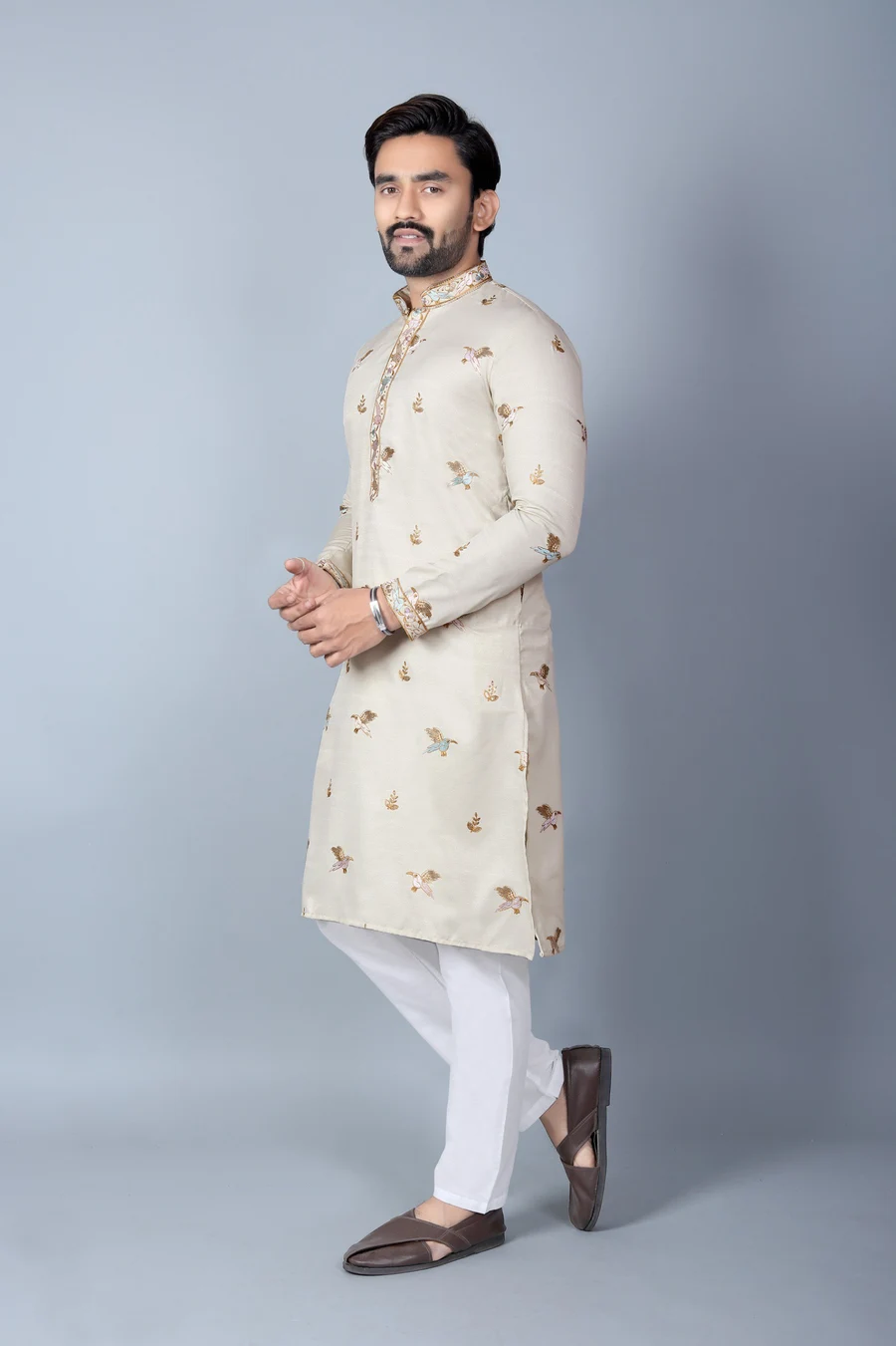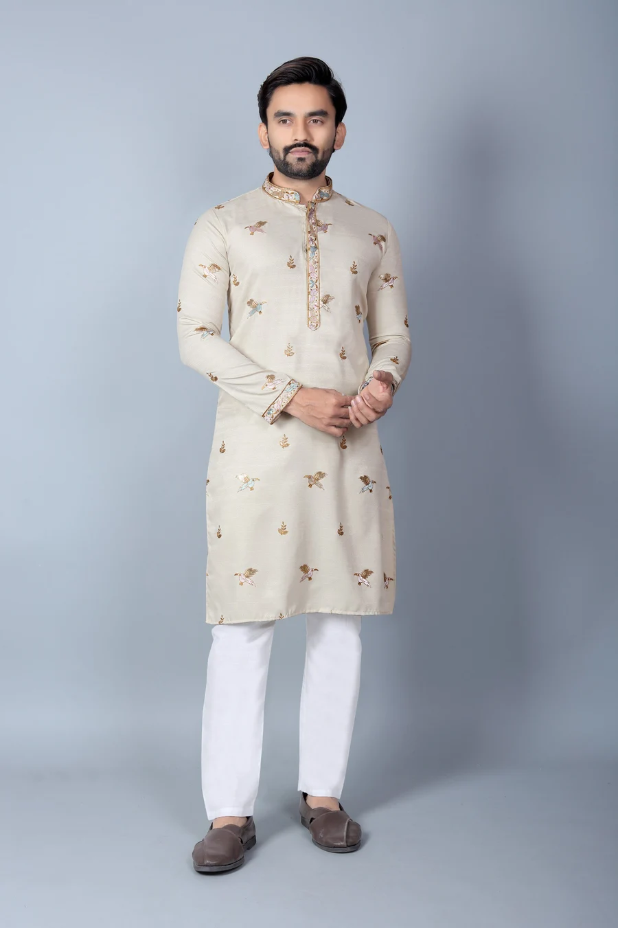 NEW ARRIVAL KHADI SILK THREAD WORK MEN’S KURTA PAYJAMA OFF WHITE