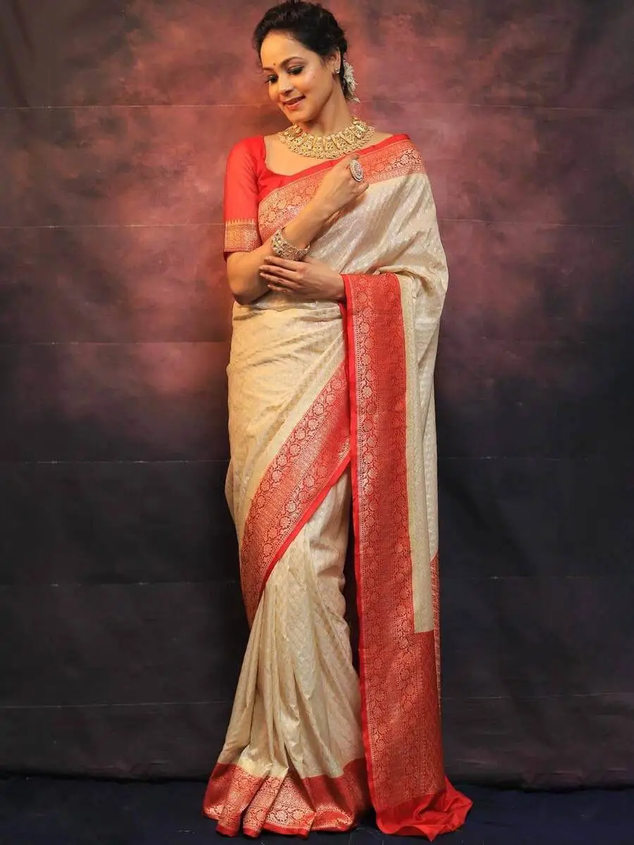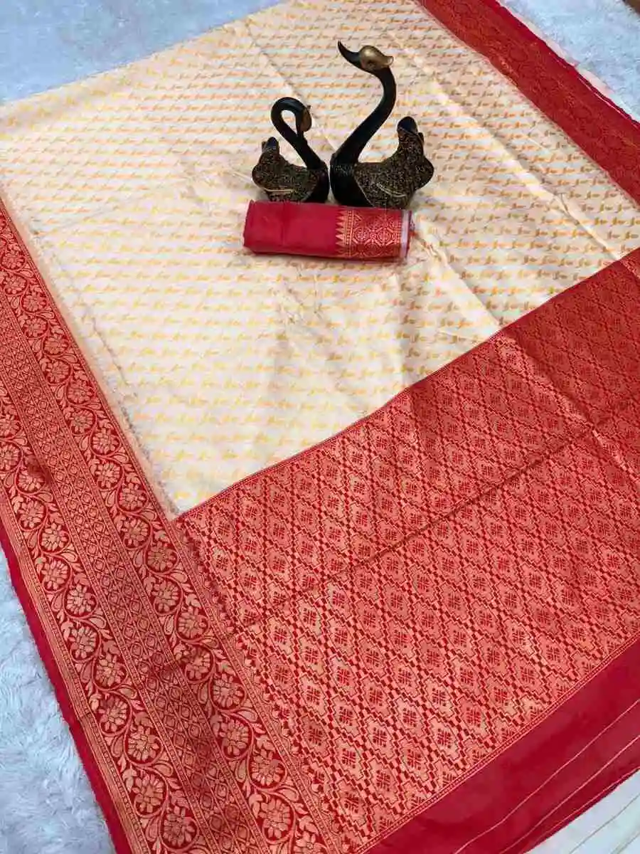 NEW ARRIVAL LICHI SILK BANARASI WEAVING WORK SAREE WITH UNSTITCHED BLOUSE RED AND CREAM