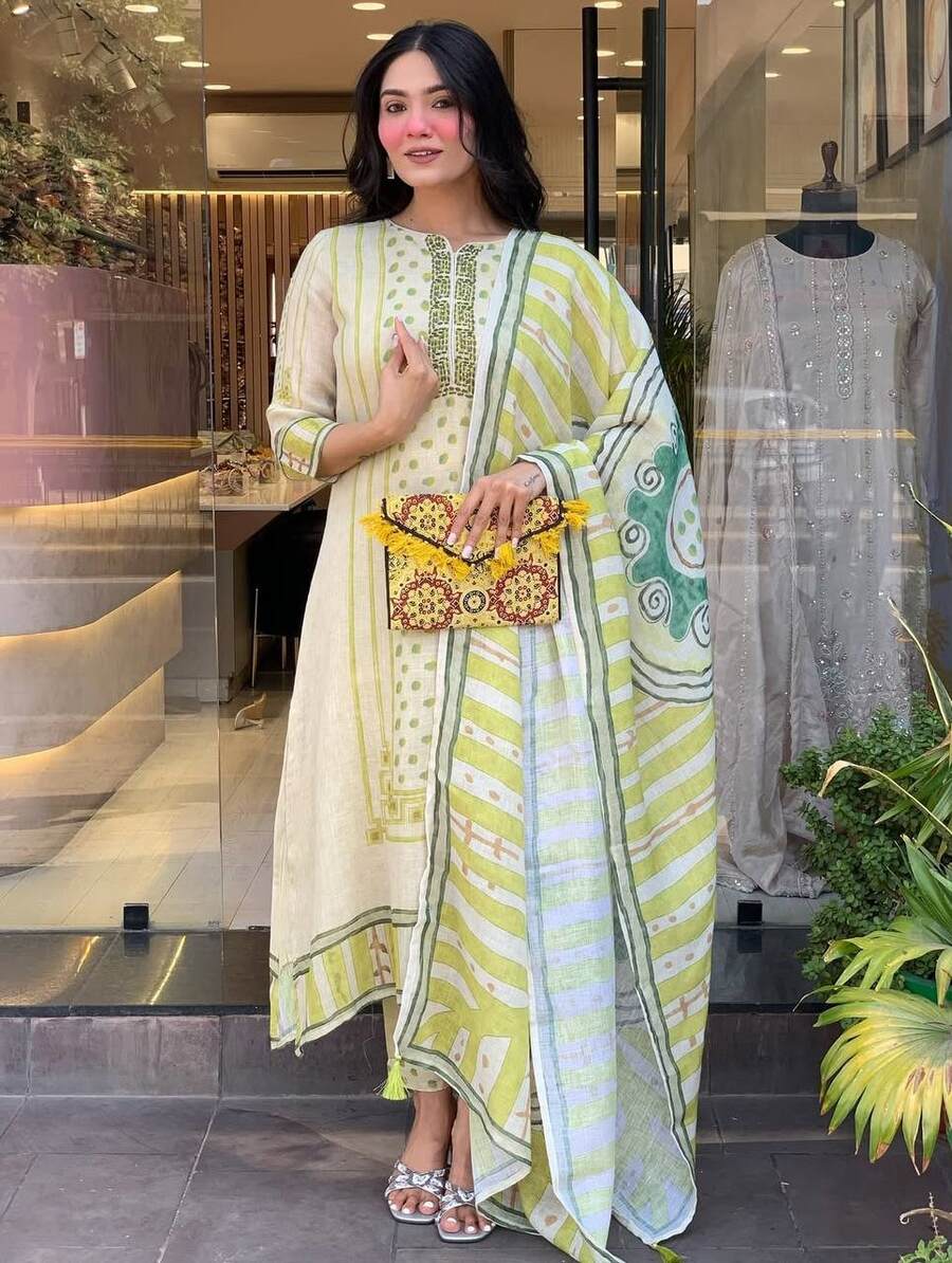 NEW ARRIVAL LINEN COTTON SEQUENCE EMBROIDERY WORK TOP BOTTOM WITH DUPATTA YELLOW