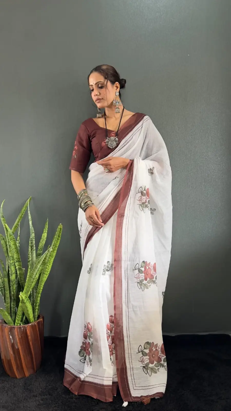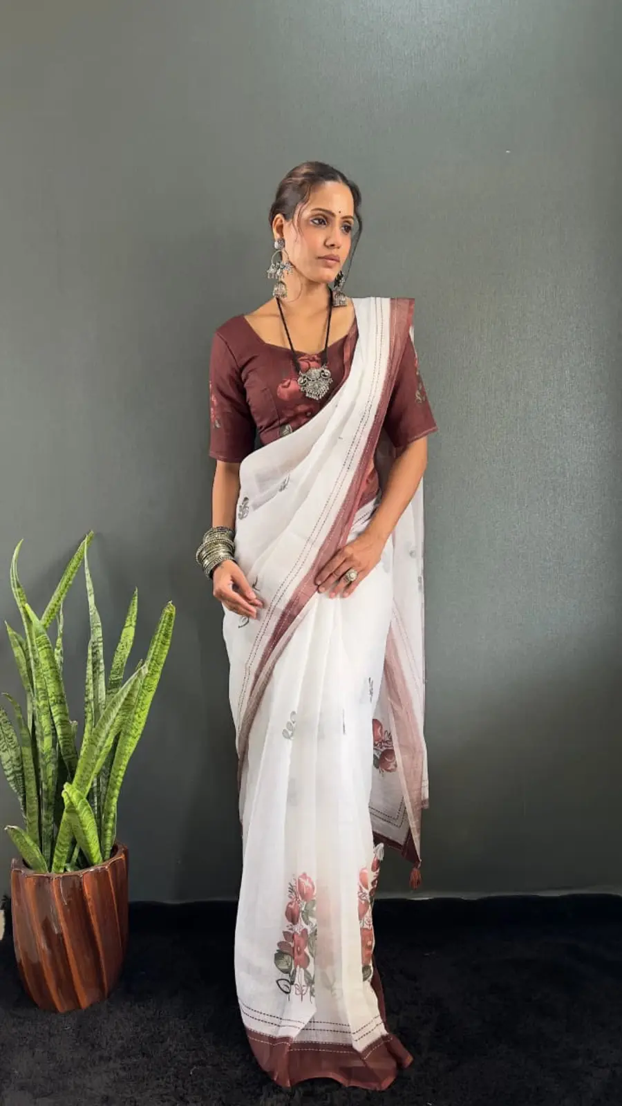 NEW ARRIVAL LINEN SILK DIGITAL PRINT WORK READY TO WEAR SAREE WITH UNSTITCHED BLOUSE BROWN
