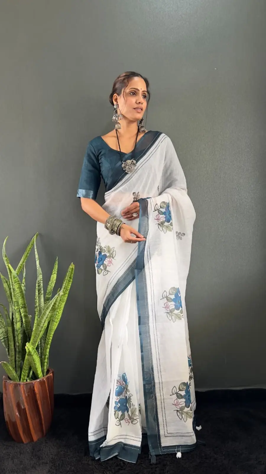 NEW ARRIVAL LINEN SILK DIGITAL PRINT WORK READY TO WEAR SAREE WITH UNSTITCHED BLOUSE TEAL