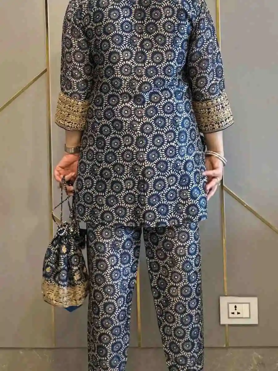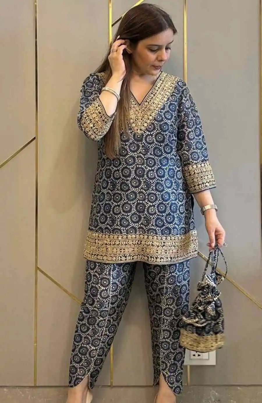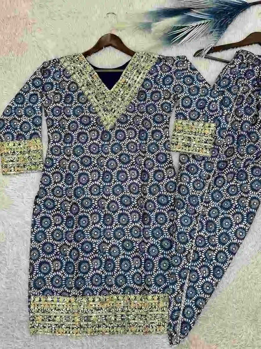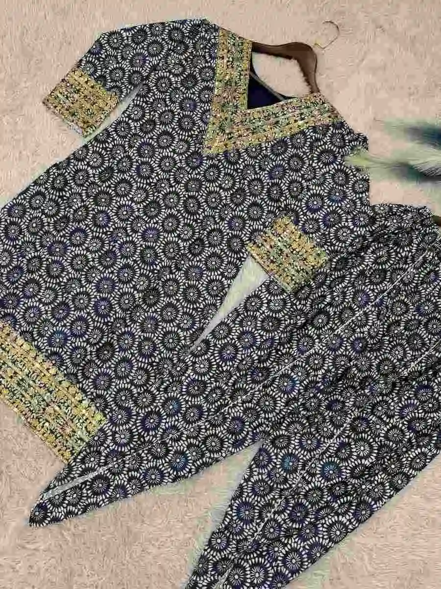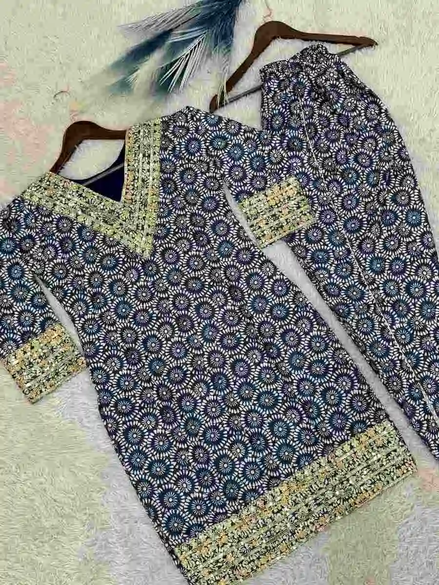 NEW ARRIVAL NATURAL CREPE EMBROIDERY AND SEQUENCE WITH DIGITAL PRINT WORK CO-ORD SET BLUE