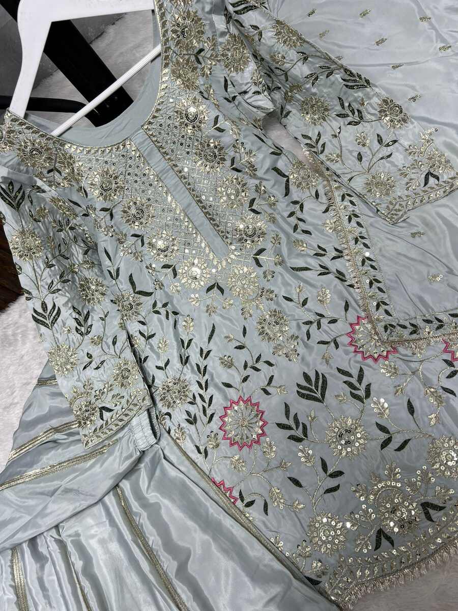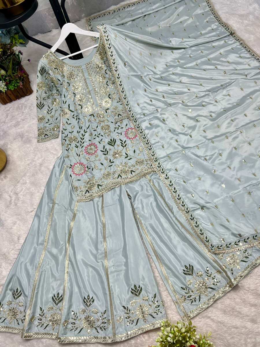 NEW ARRIVAL NATURAL CREPE EMBROIDERY AND SEQUENCE WORK TOP PALAZZO WITH DUPATTA SKY