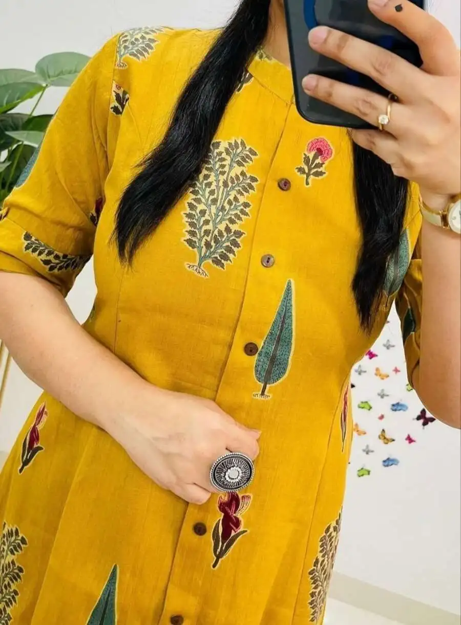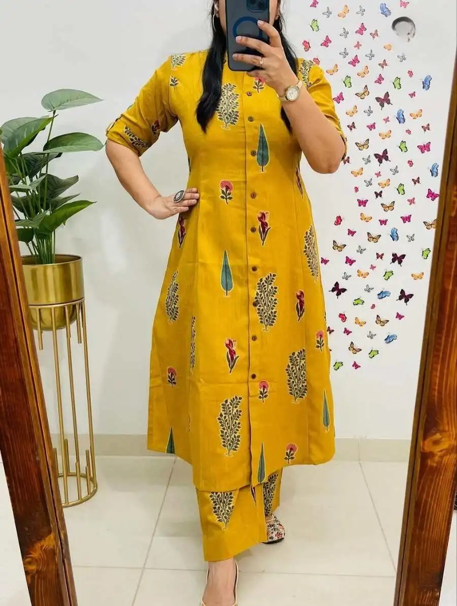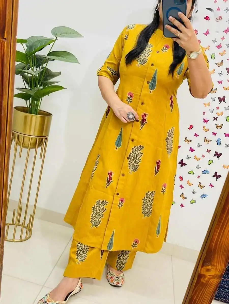 NEW ARRIVAL POLY RAYON FLORAL PRINT WORK TOP BOTTOM SET YELLOW