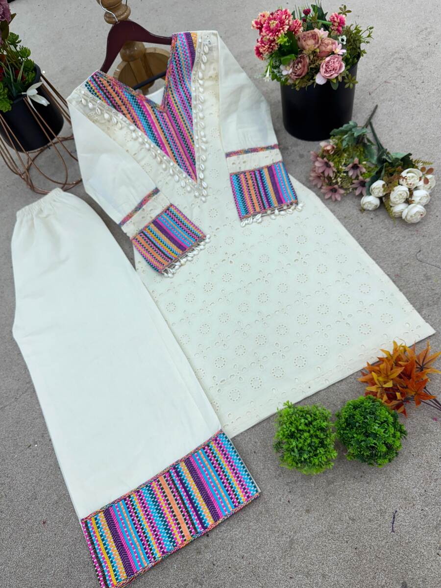 NEW ARRIVAL PURE KHADI COTTON SCHIFFLI WORK WITH THREAD WORK TOP PALAZZO SET WHITE