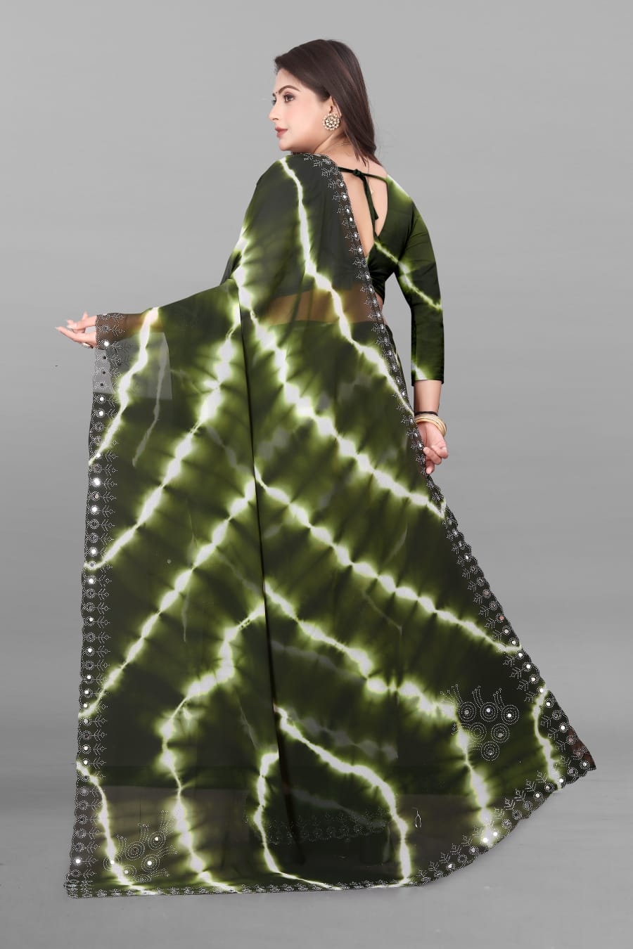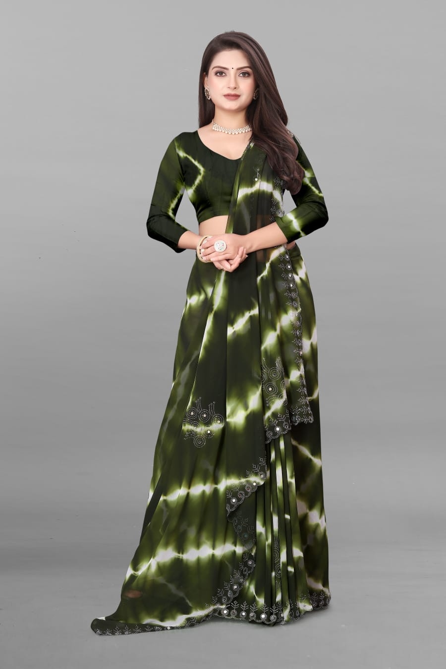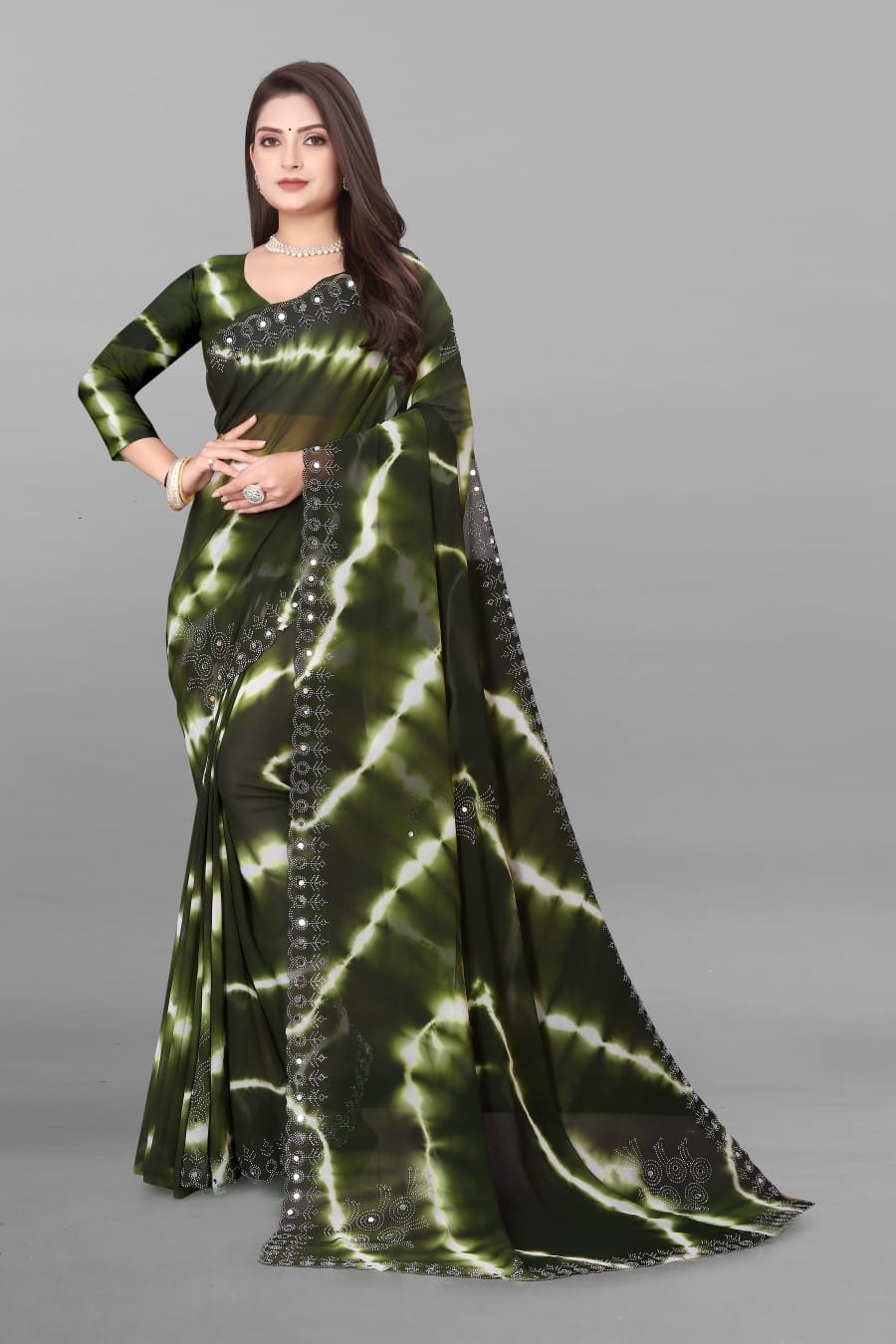 NEW ARRIVAL PURE VETLESS HOT FIX WORK SAREE WITH UNSTITCHED BLOUSE MEHNDI
