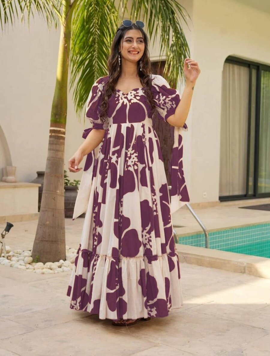 NEW ARRIVAL RAYON DIGITAL PRINTED WORK ONE PEICE DRESS PURPLE