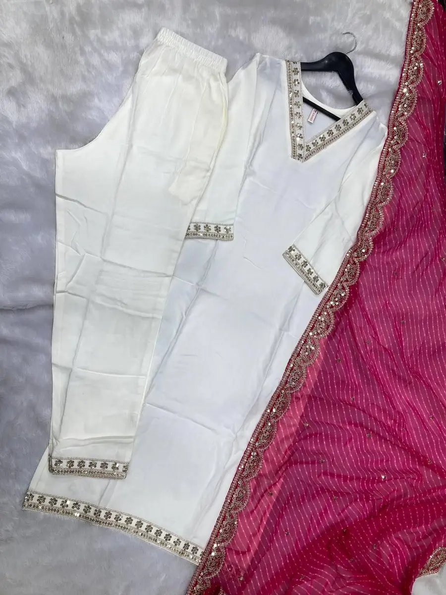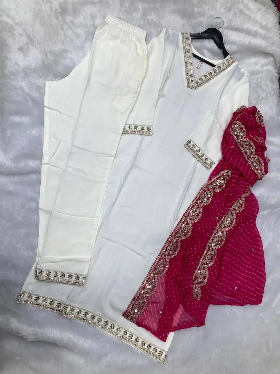 NEW ARRIVAL RAYON EMBROIDERY BORDER WORK TOP BOTTOM WITH DUPATTA WHITE AND RANI