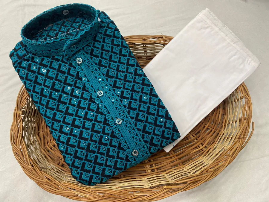 NEW ARRIVAL RAYON EMBROIDERY SEQUENCE WORK MEN’S KURTA PAYJAMA RAMA