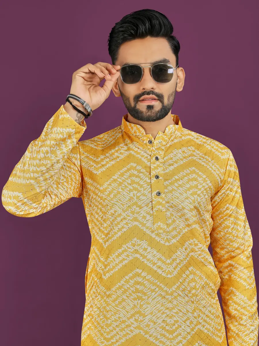 NEW ARRIVAL RAYON LAHERIYA DIGITAL PRINT AND CROCHET EMBROIDERY WORK MEN’S KURTA PAYJAMA YELLOW