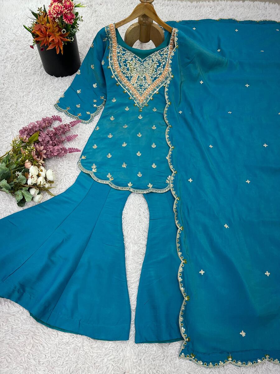 NEW ARRIVAL SHIMMER SILK EMBROIDERY WORK TOP PALAZZO WITH DUPATTA RAMA