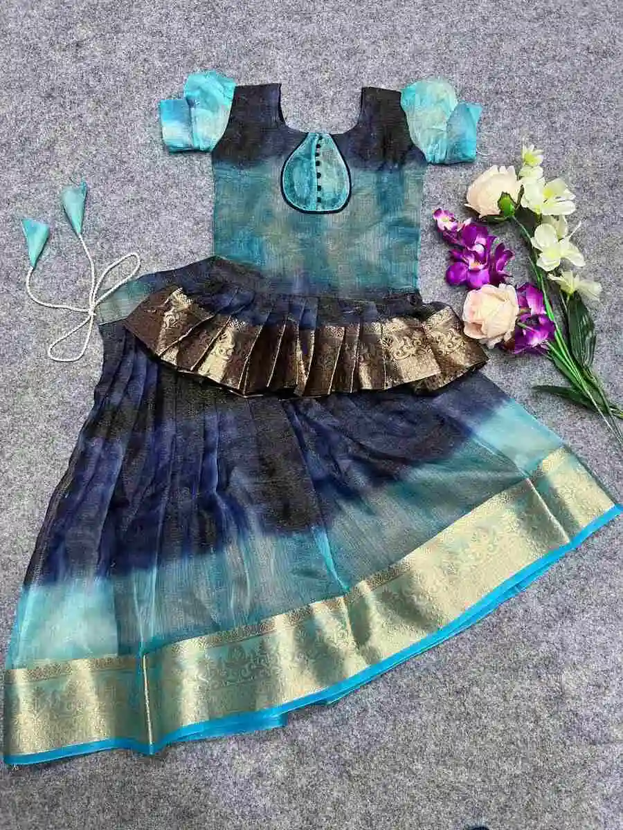 NEW ARRIVAL SHIMMER SILK GOLD ZARI BORDER WORK TOP LEHENGA SKY AND BLUE