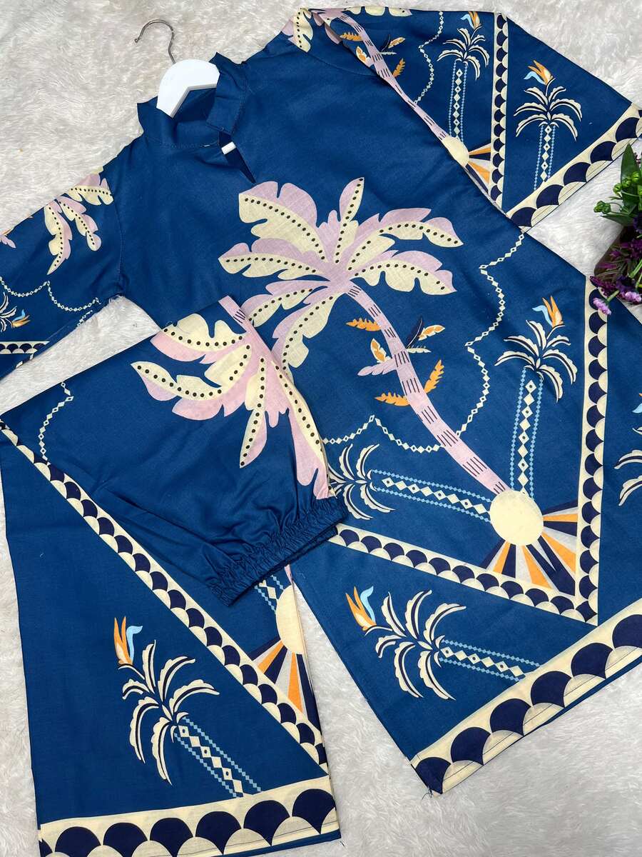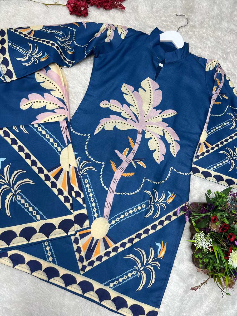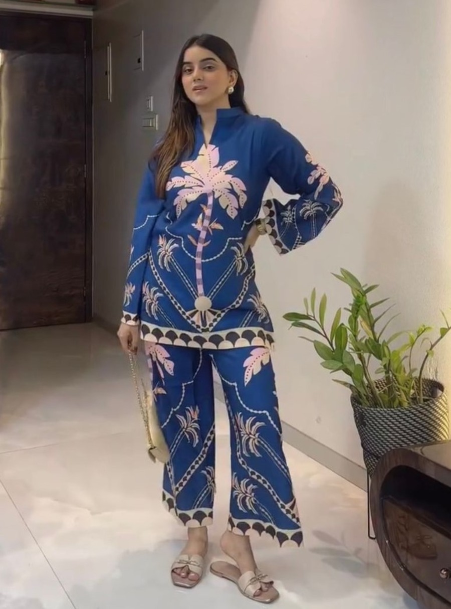 NEW ARRIVAL SLUB COTTON DIGITAL PRINT WORK CO-ORD SET BLUE