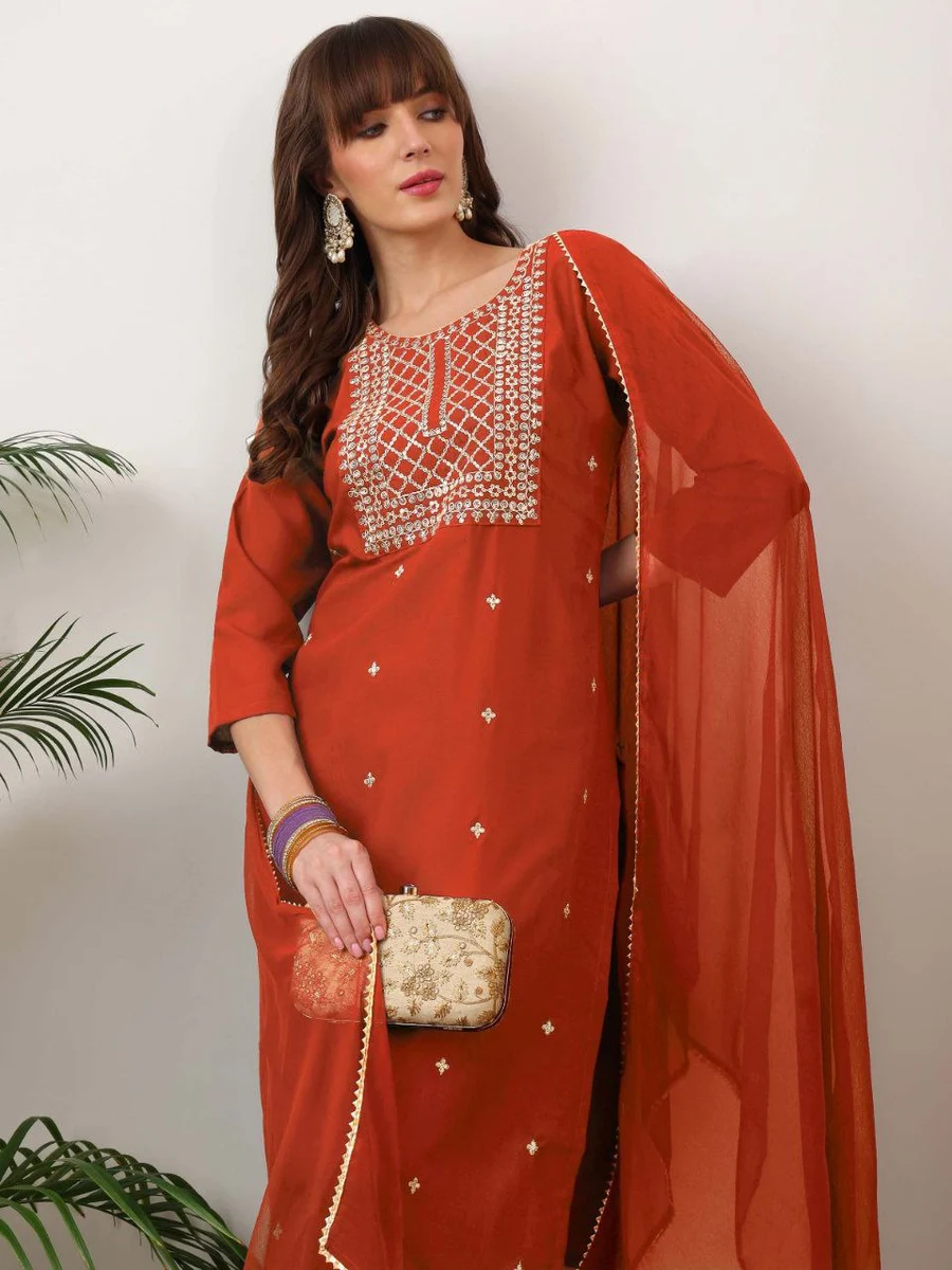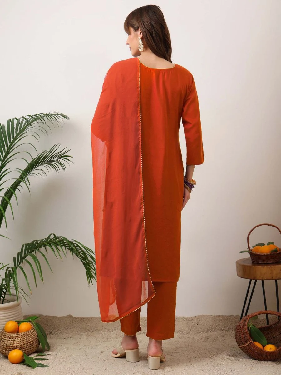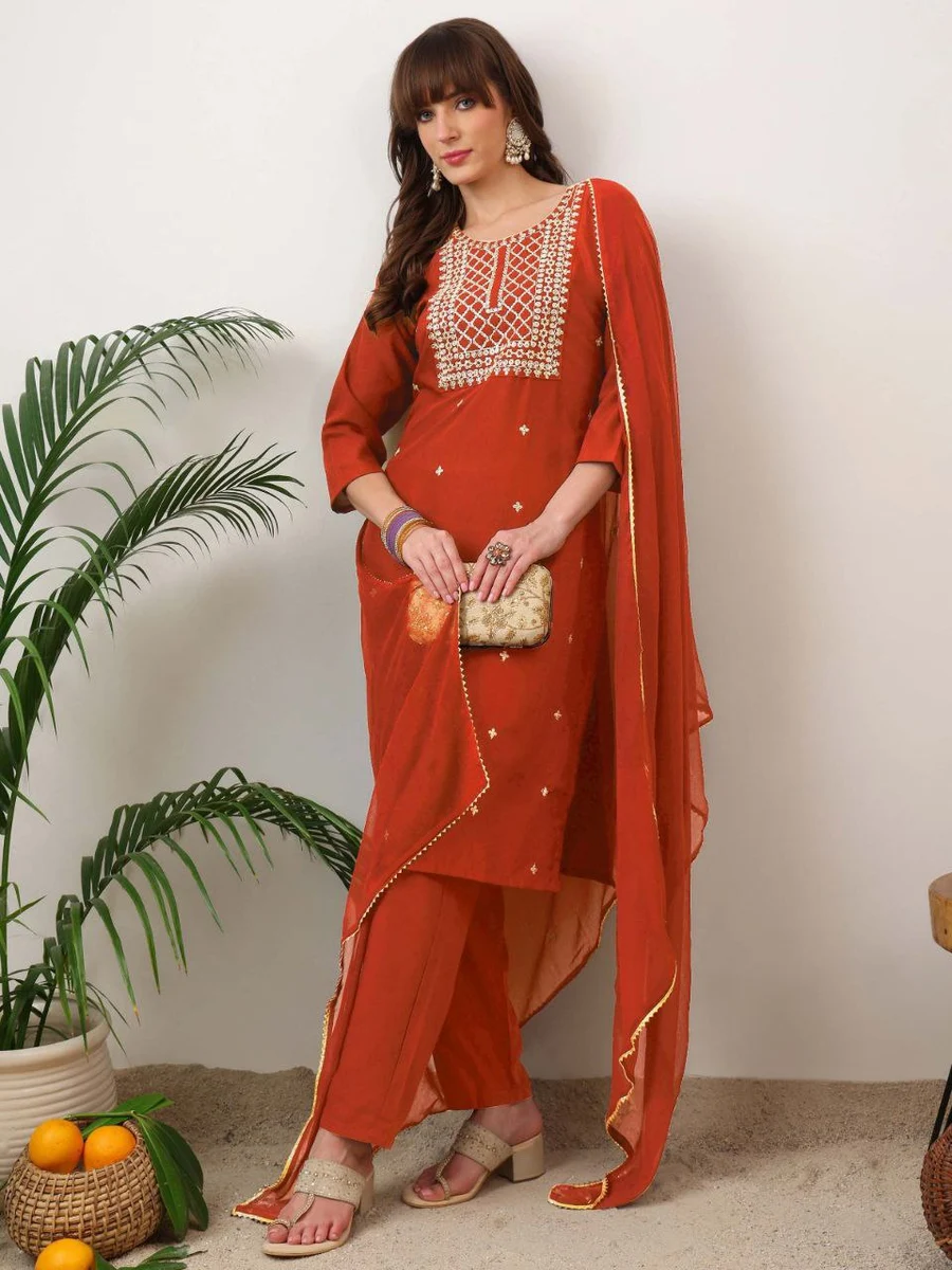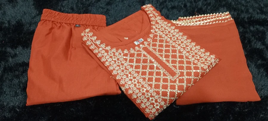 NEW ARRIVAL SLUB COTTON EMBROIDERY WORK TOP BOTTOM WITH DUPATTA ORANGE