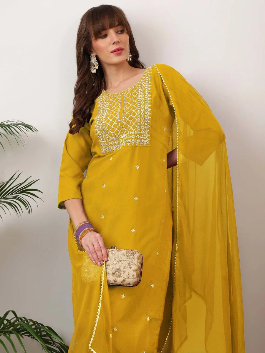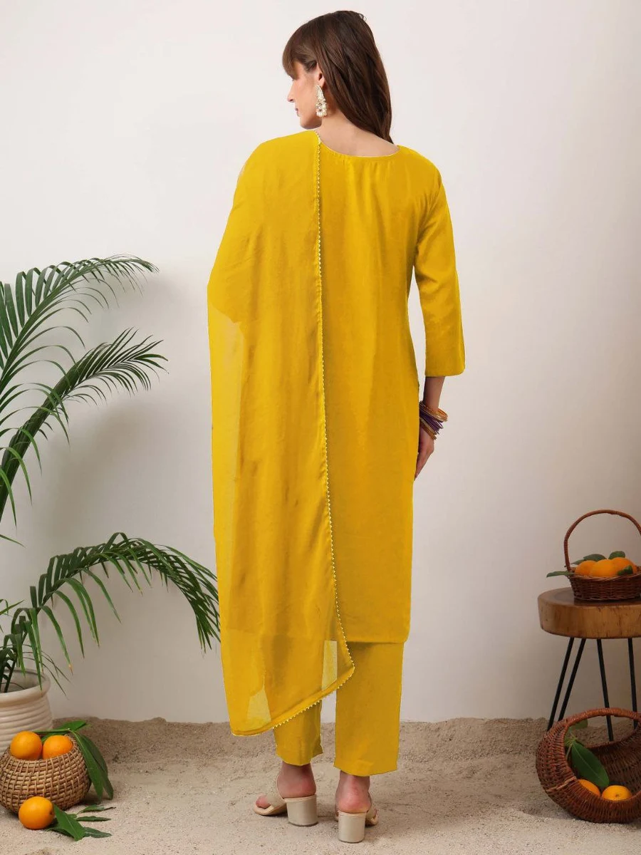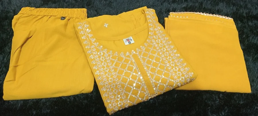 NEW ARRIVAL SLUB COTTON EMBROIDERY WORK TOP BOTTOM WITH DUPATTA YELLOW