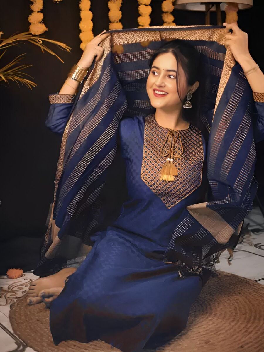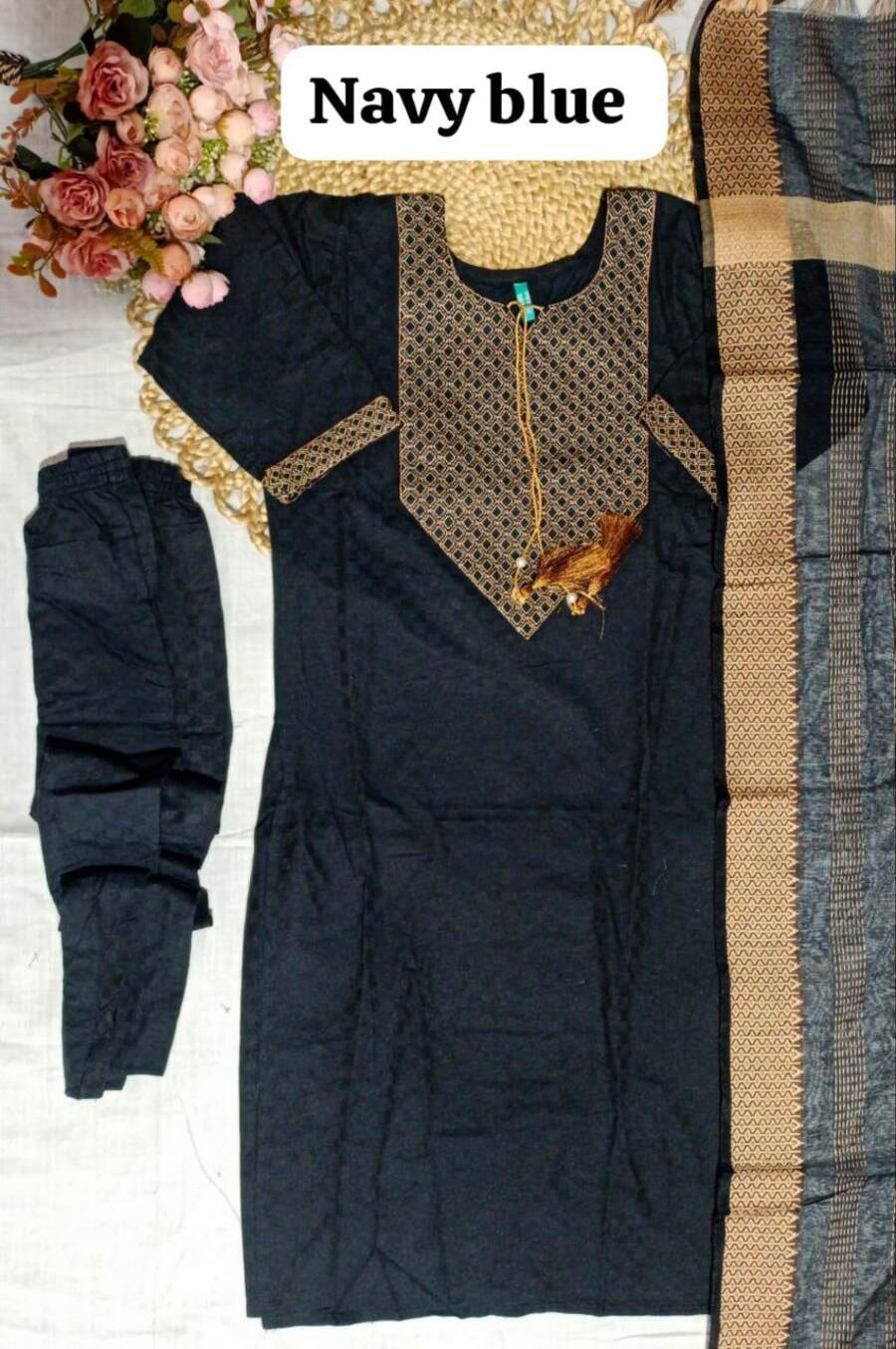 NEW ARRIVAL SOUTH COTTON THREAD EMBROIDERY WORK TOP BOTTOM WITH DUPATTA NAVY BLUE
