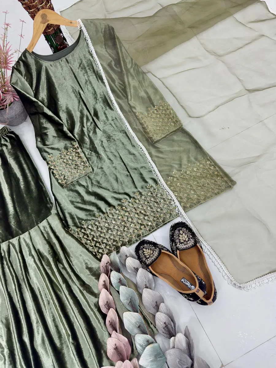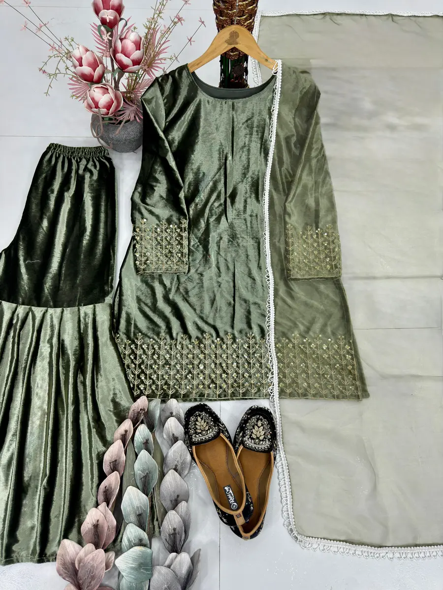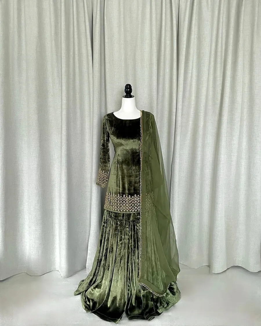 NEW ARRIVAL VELVET EMBROIDERY CODING SEQUENCE WORK TOP SHARARA WITH DUPATTA MEHNDI