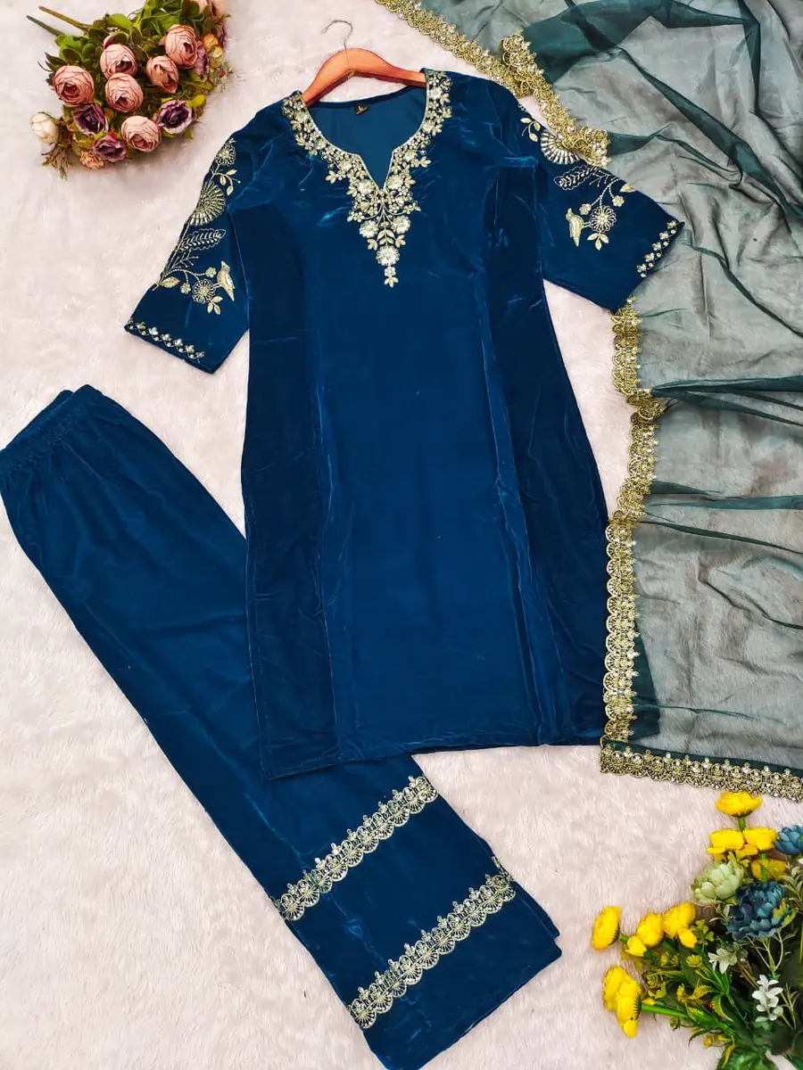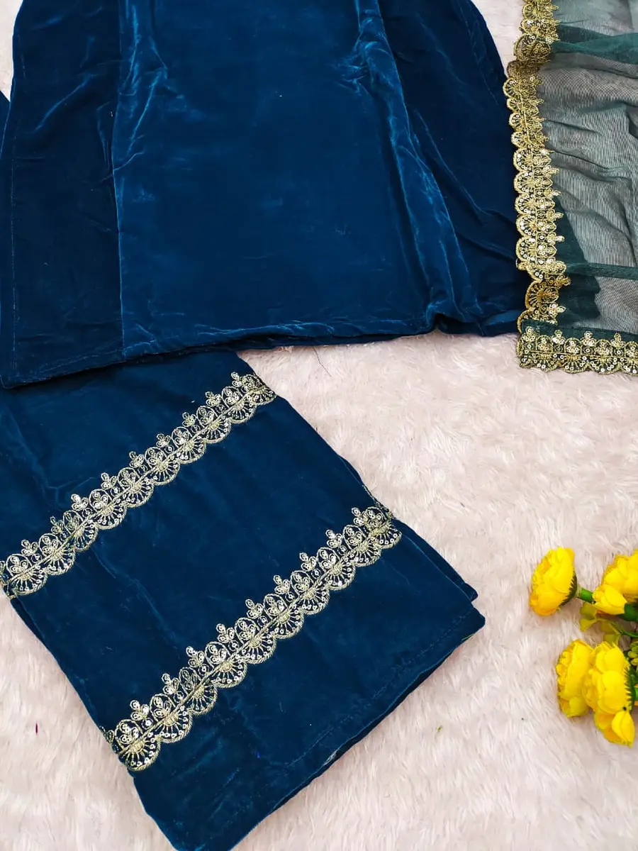 NEW ARRIVAL VELVET EMBROIDERY SEQUENCE WORK TOP BOTTOM WITH DUPATTA BLUE