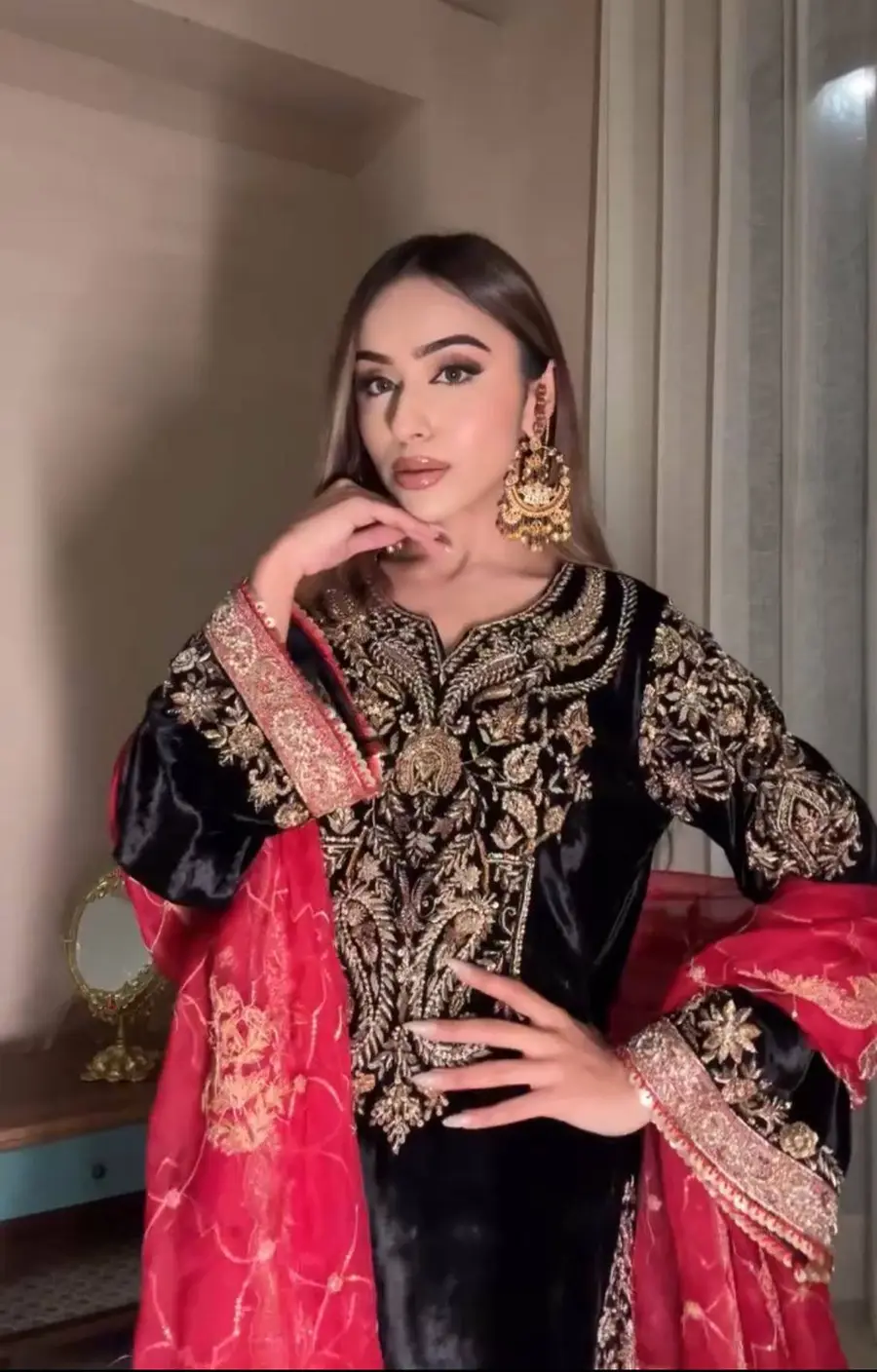 NEW ARRIVAL VELVET SEQUENCE & ZARI EMBROIDERY WORK TOP PALAZZO WITH DUPATTA RED AND BLACK