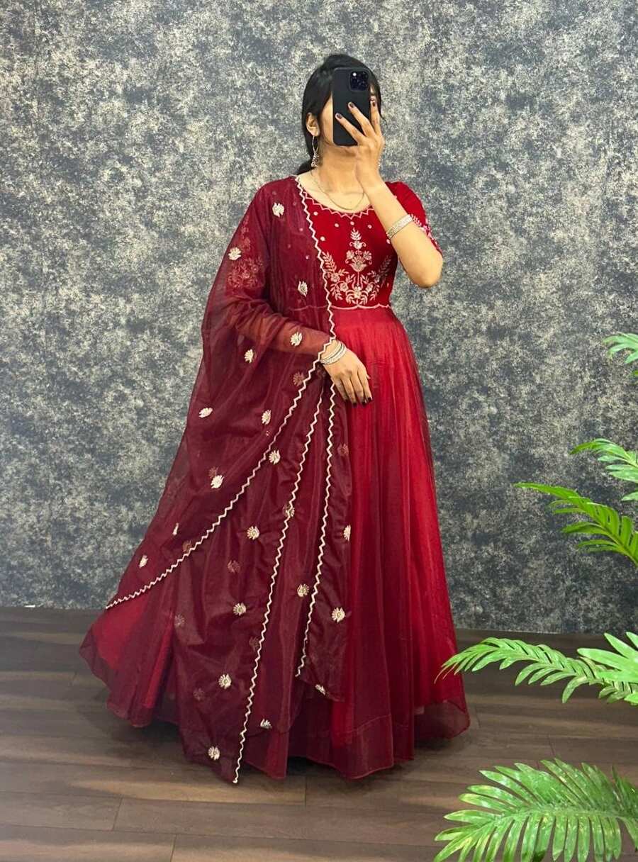 NEW ARRIVAL VELVET WITH TISSUE NET EMBROIDERY WORK GOWN WITH DUPATTA RED