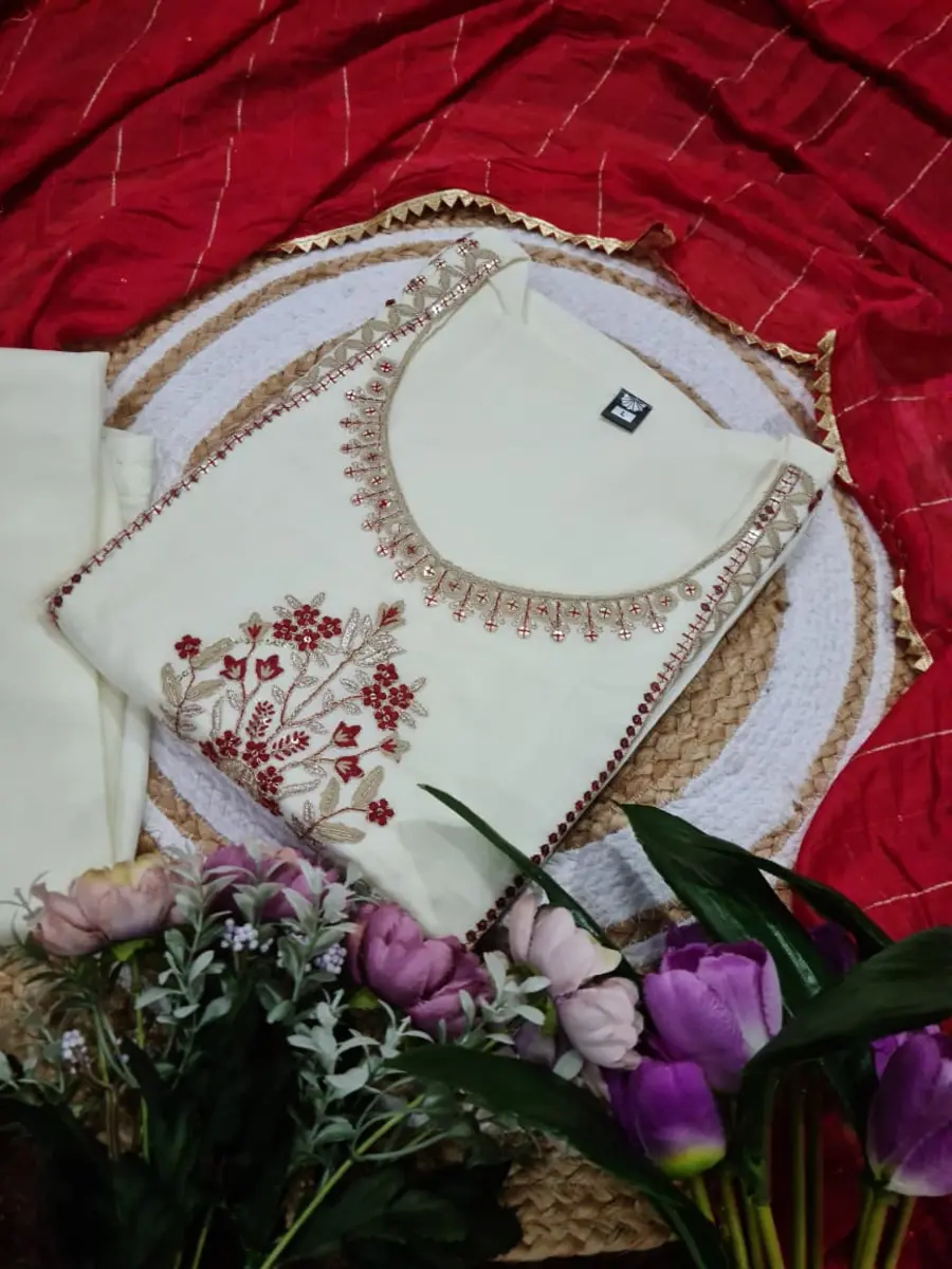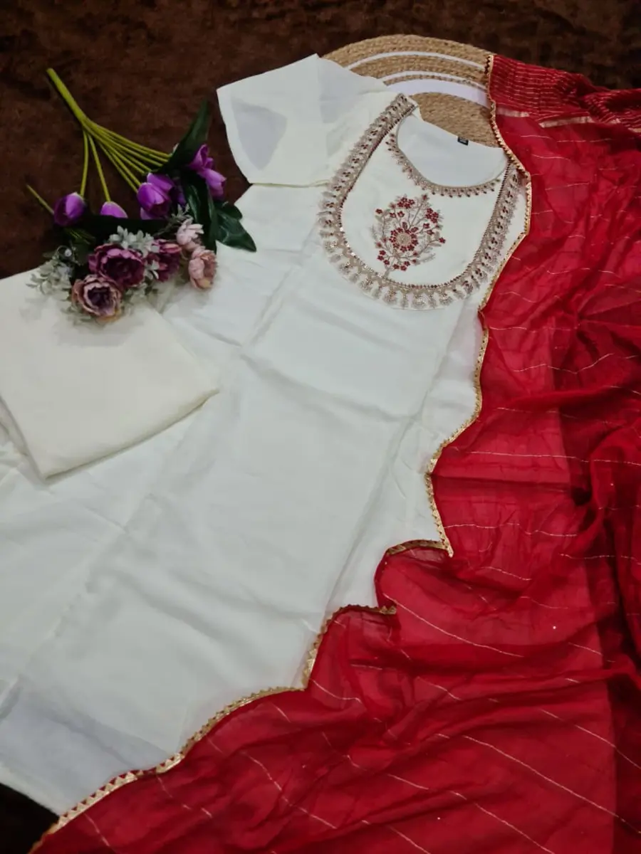 NEW ARRIVAL VICHITRA SEQUENCE CODING EMBROIDERY WORK TOP BOTTOM WITH DUPATTA RED AND OFF WHITE
